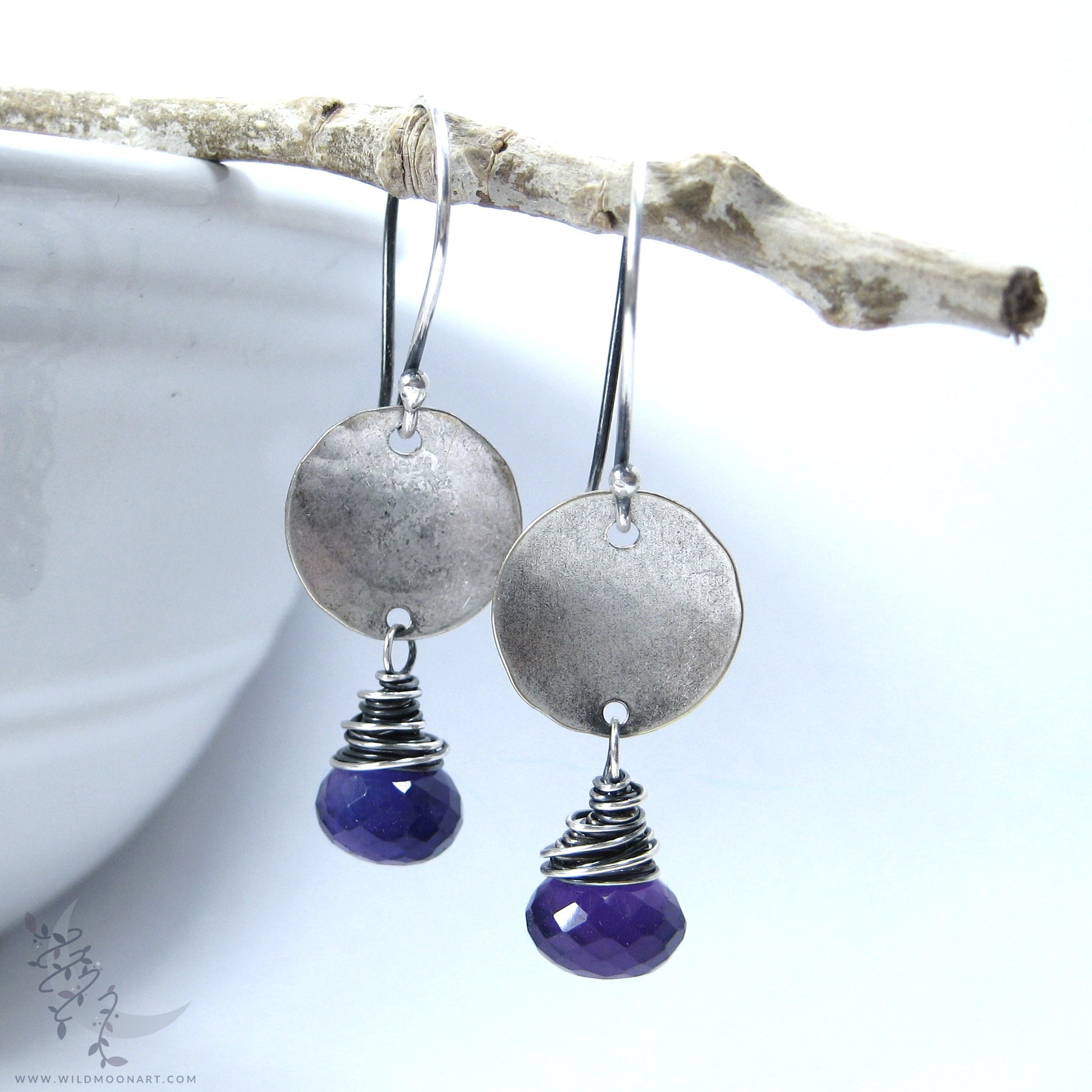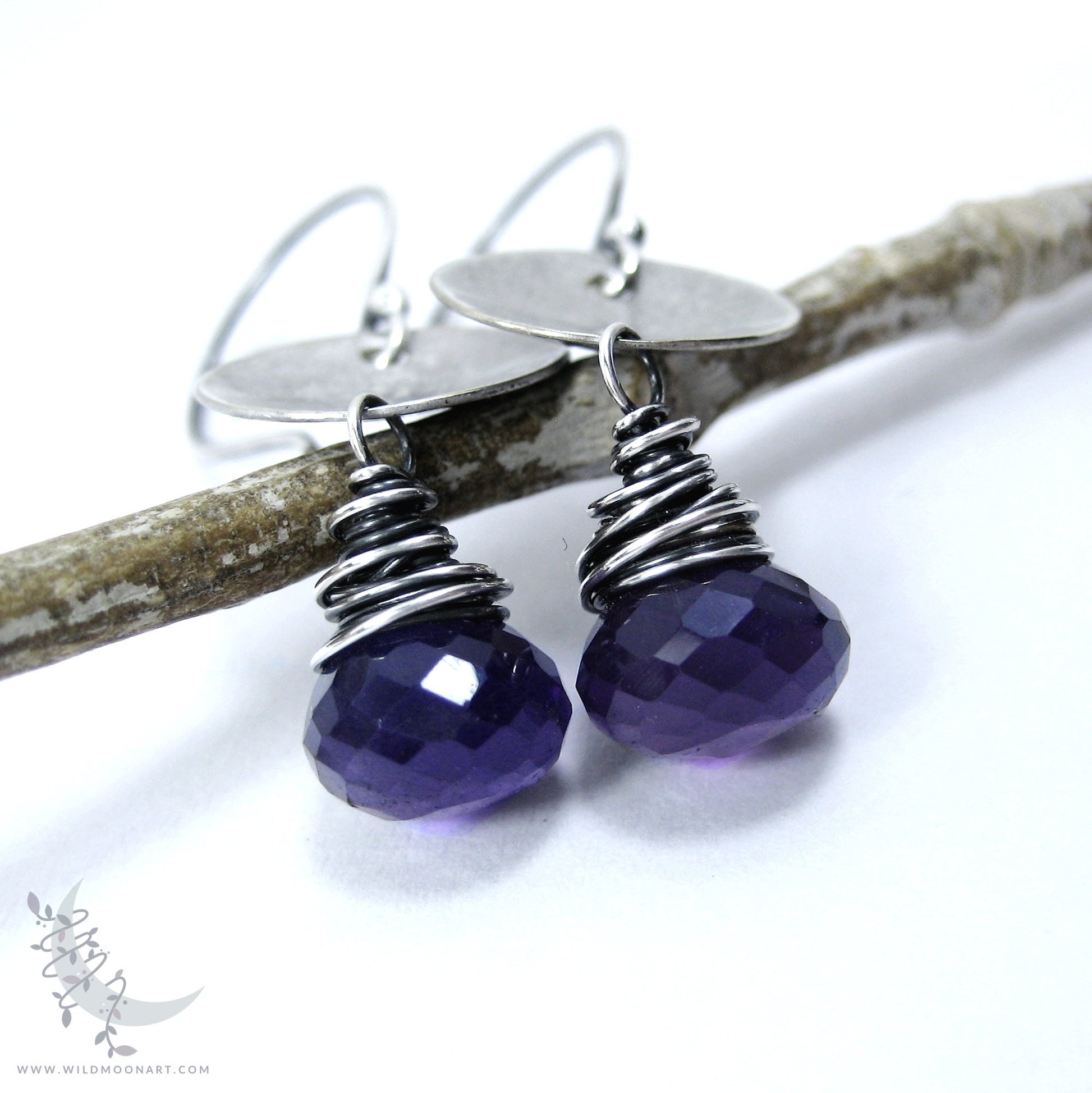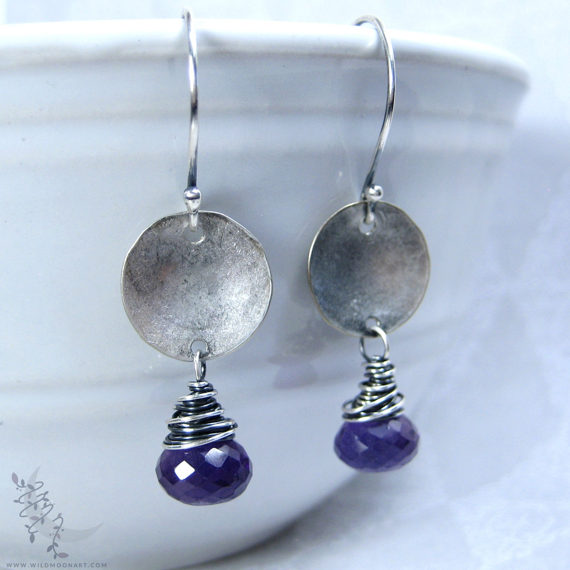 Dainty genuine amethyst gemstone "onion" briolettes are wire wrapped in sterling silver and sway from hand hammered concave silver discs and hand formed sterling silver ear wires. The sterling silver was oxidized (antiqued/aged) to a deep charcoal patina, then hand brushed and polished to bring out the silver highlights. This creates a natural, slightly rustic finish with depth and a mix of matte & shine.