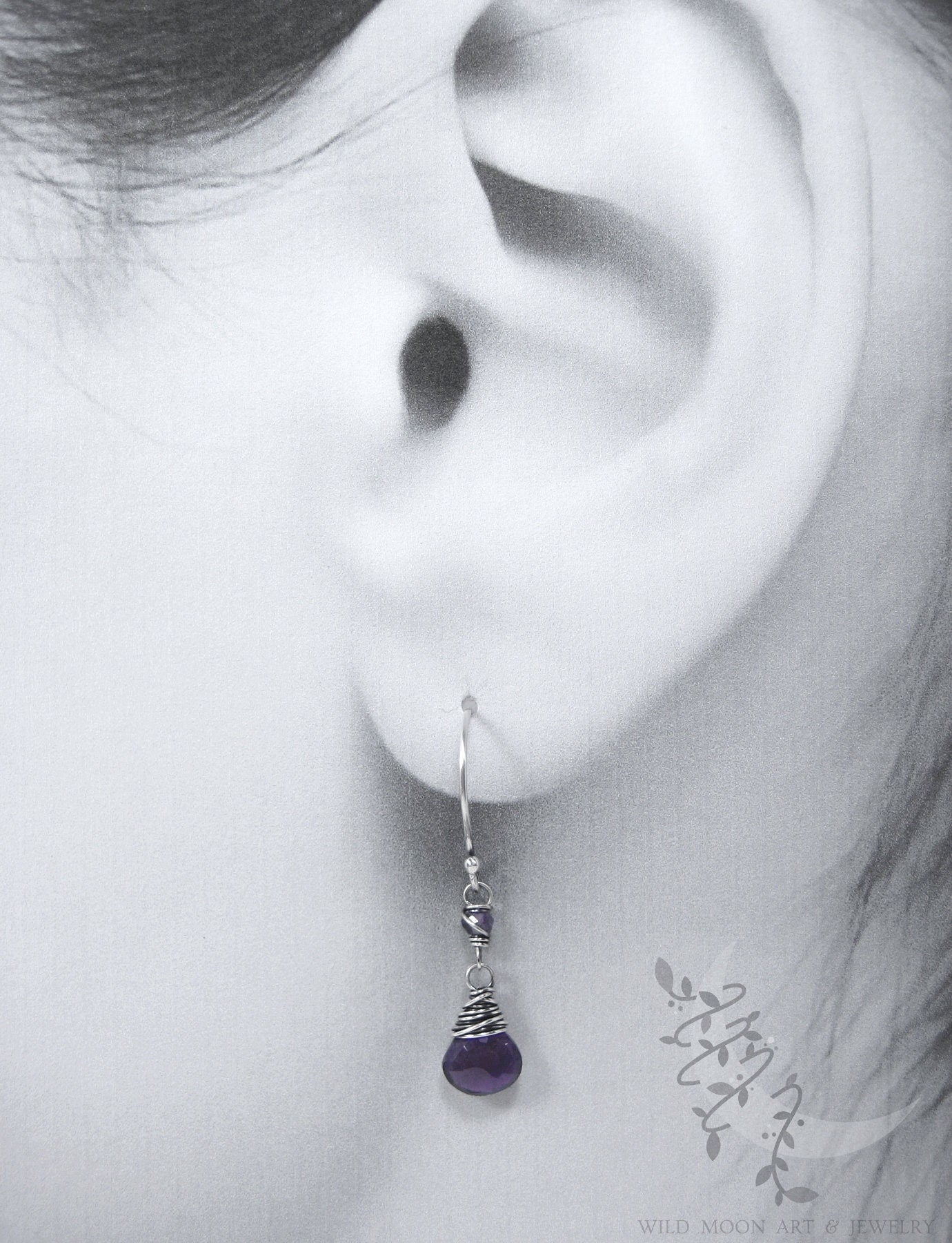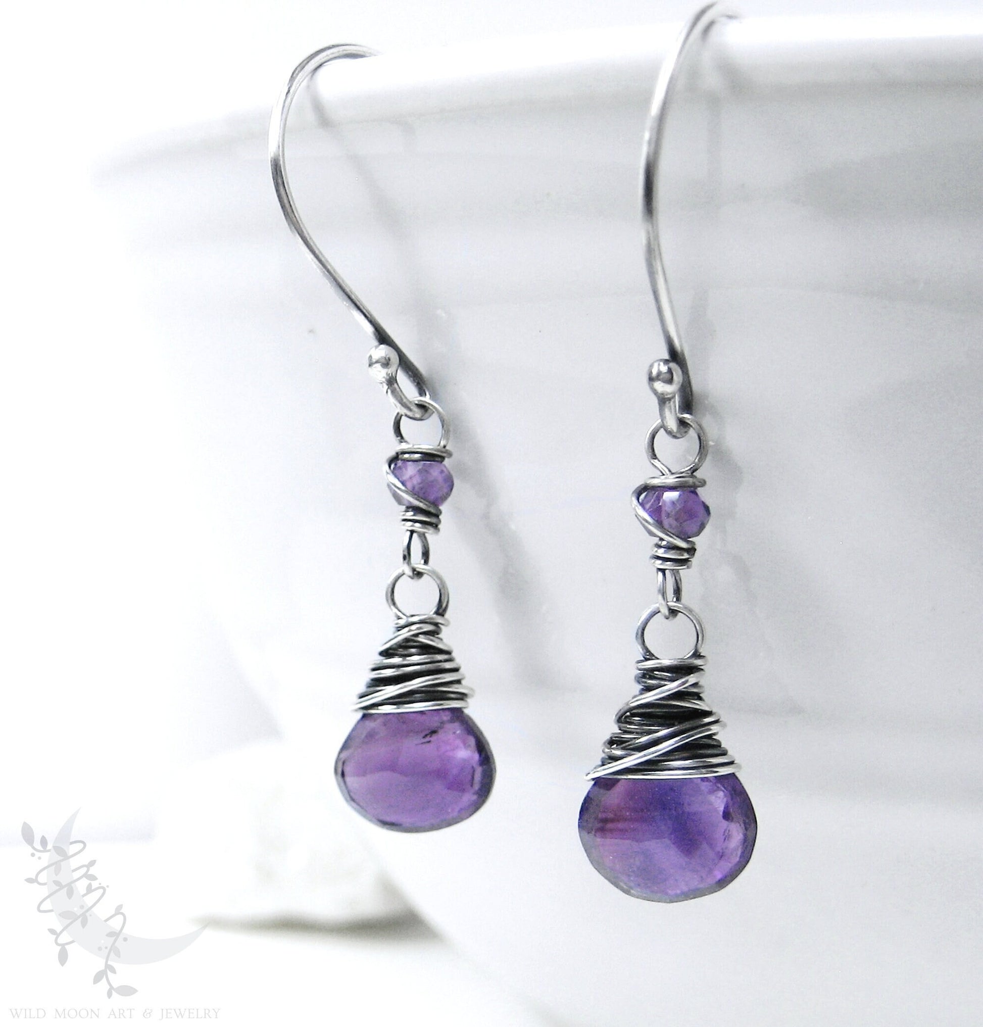 Petite genuine amethyst gemstones are wire wrapped in sterling silver and dangle from handmade sterling silver ear wires. The sterling silver was oxidized (aged/antiqued) to a dark charcoal patina, then hand brushed and polished to bring out the silver highlights. This creates a natural, slightly rustic finish with both depth & shine.