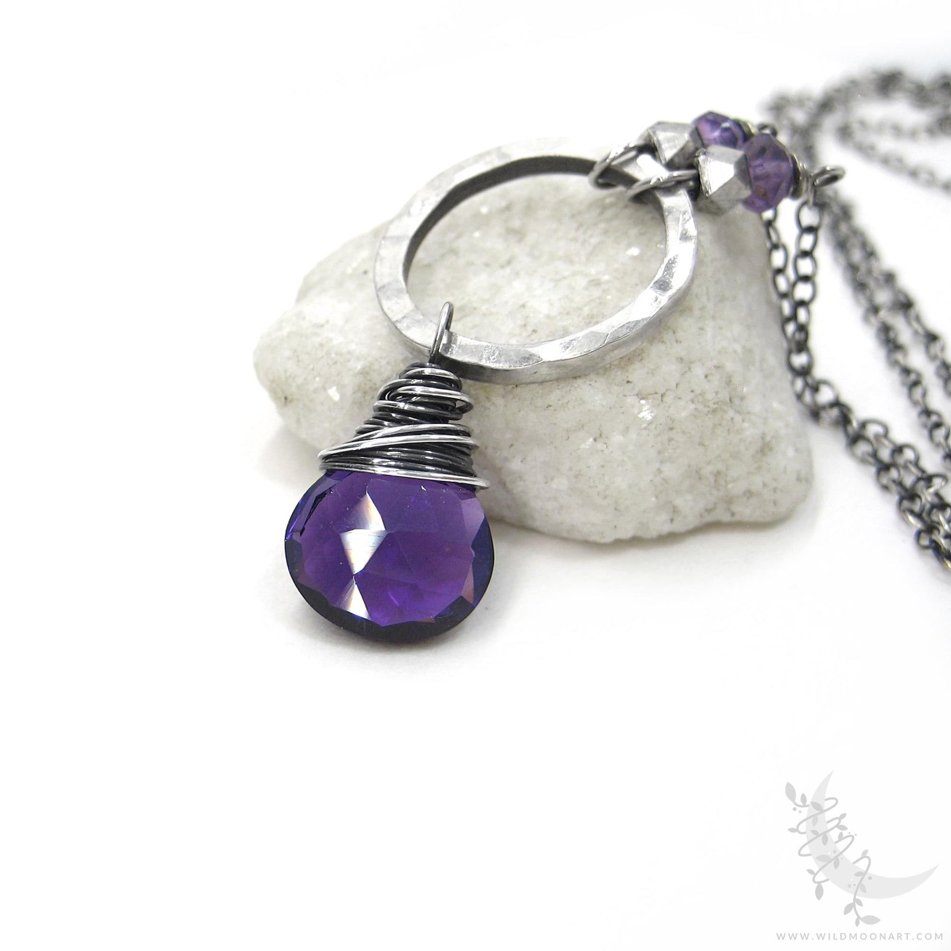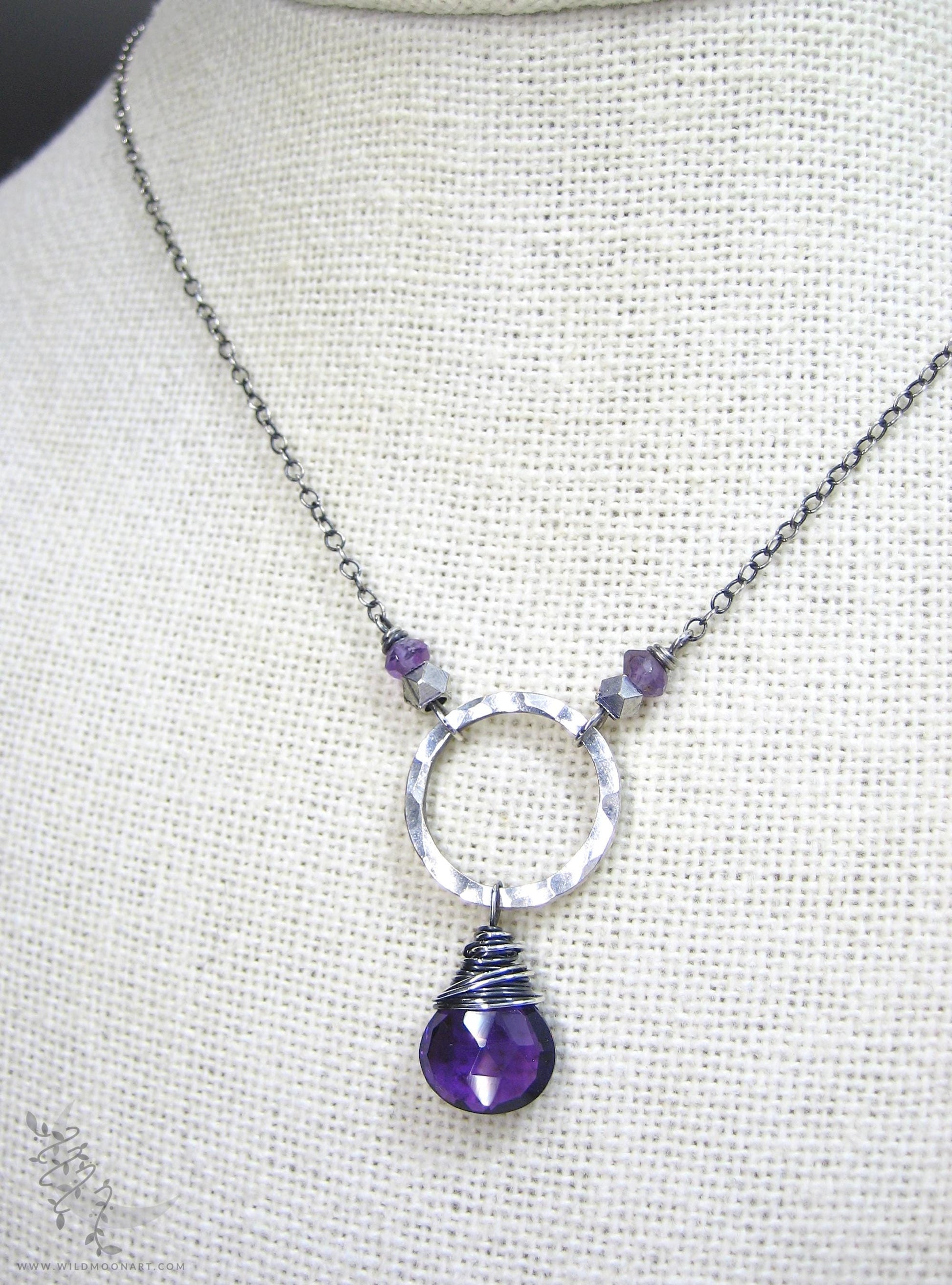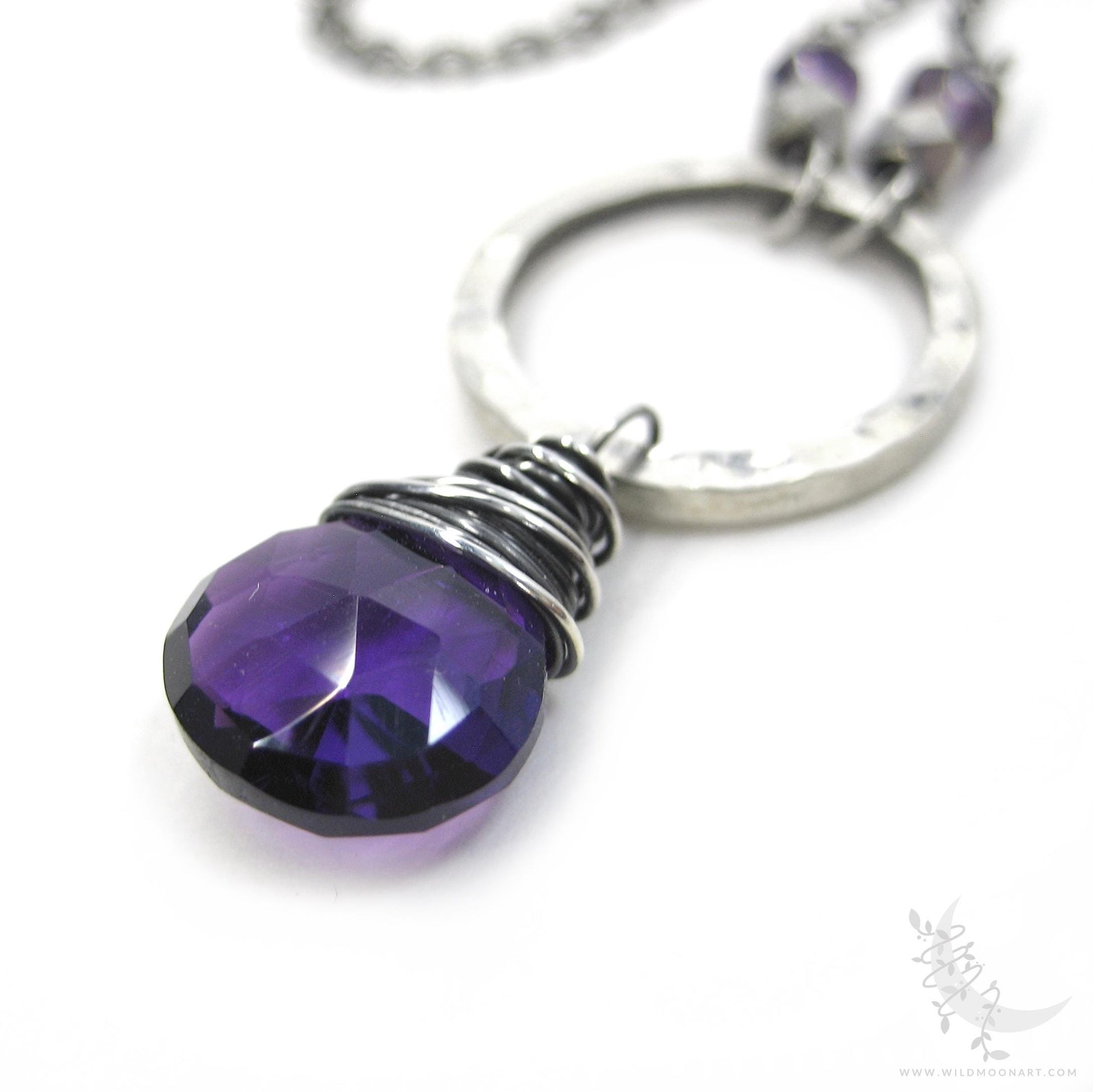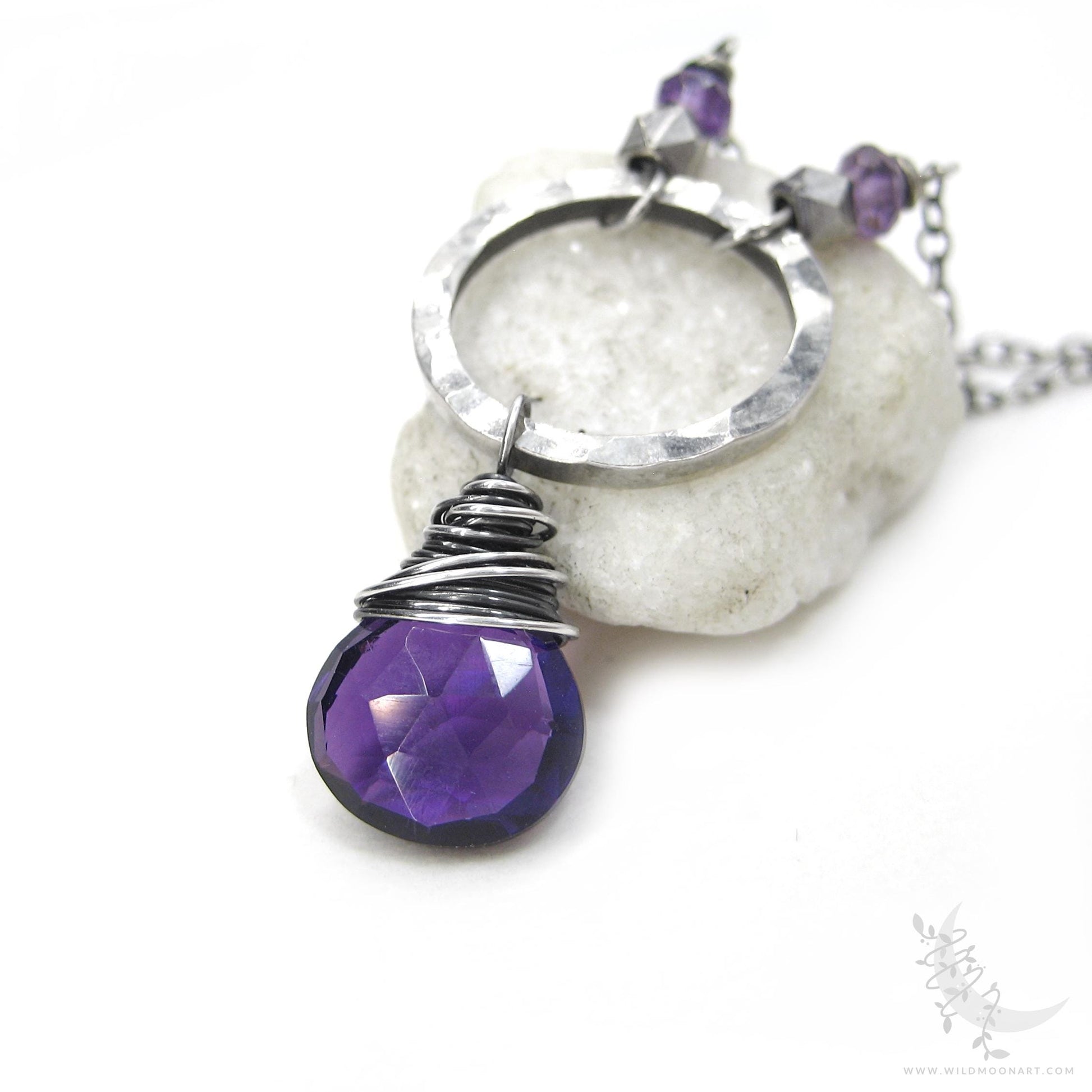 A single genuine amethyst gemstone has been wire wrapped in sterling silver and sways from a hand hammered silver circle. These are attached to a sterling silver chain via wire wrapped faceted amethyst and silver beads. The chain is finished at the ends with two additional faceted sterling silver beads and a sterling silver spring-ring clasp. The sterling silver was oxidized (antiqued) to a deep charcoal finish, then hand brushed and polished to bring out the silver highlights. This gives an organic finish with depth.