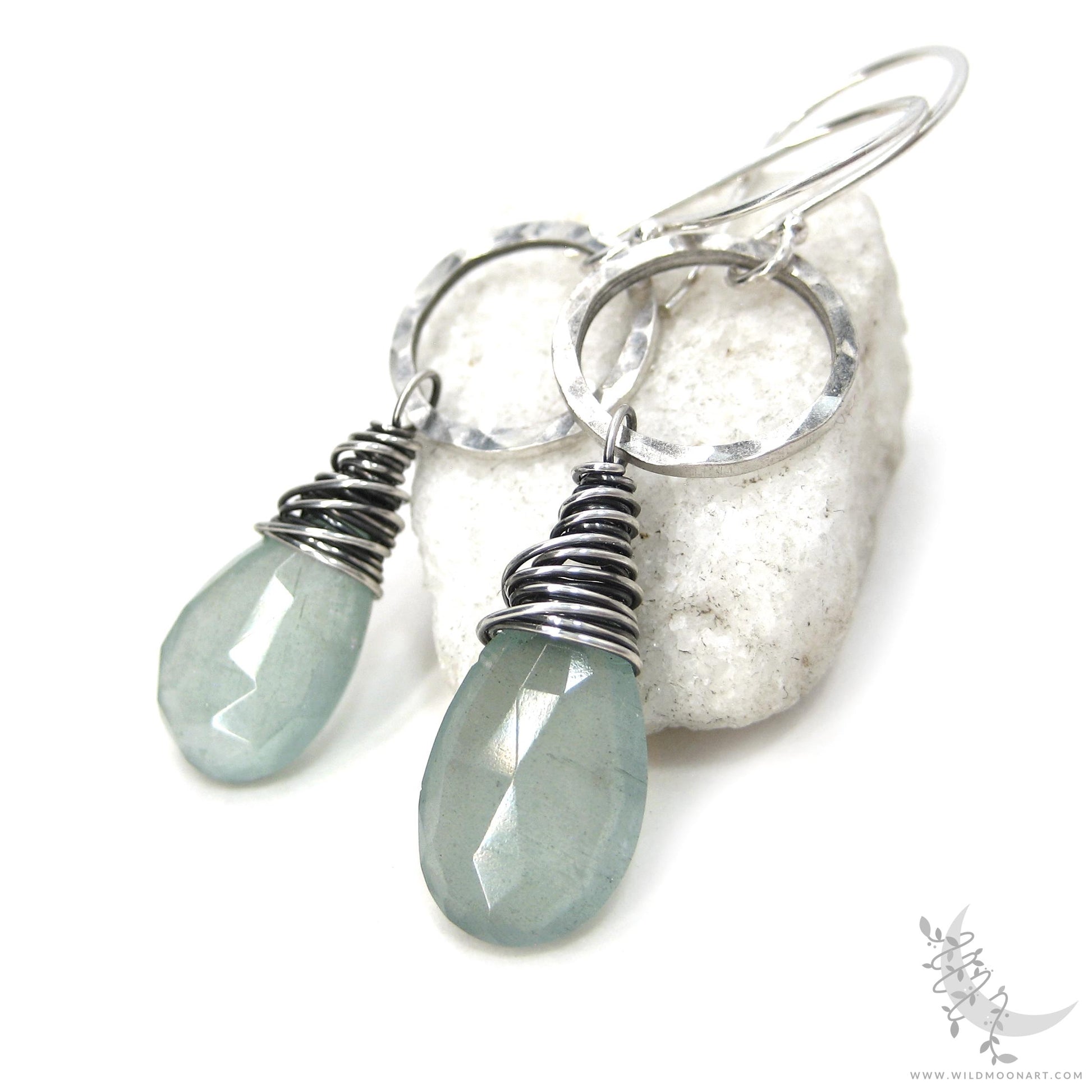 Genuine aquamarine gemstones have been wire wrapped in Sterling silver and attached to hand hammered Sterling Silver circles. These and sway from handmade solid Sterling silver ear wires. The silver wire was oxidized (antiqued) to a deep charcoal finish, then hand brushed and polished to bring out the silver highlights. This gives an organic finish with depth. The ear wires are bright shiny Sterling silver.