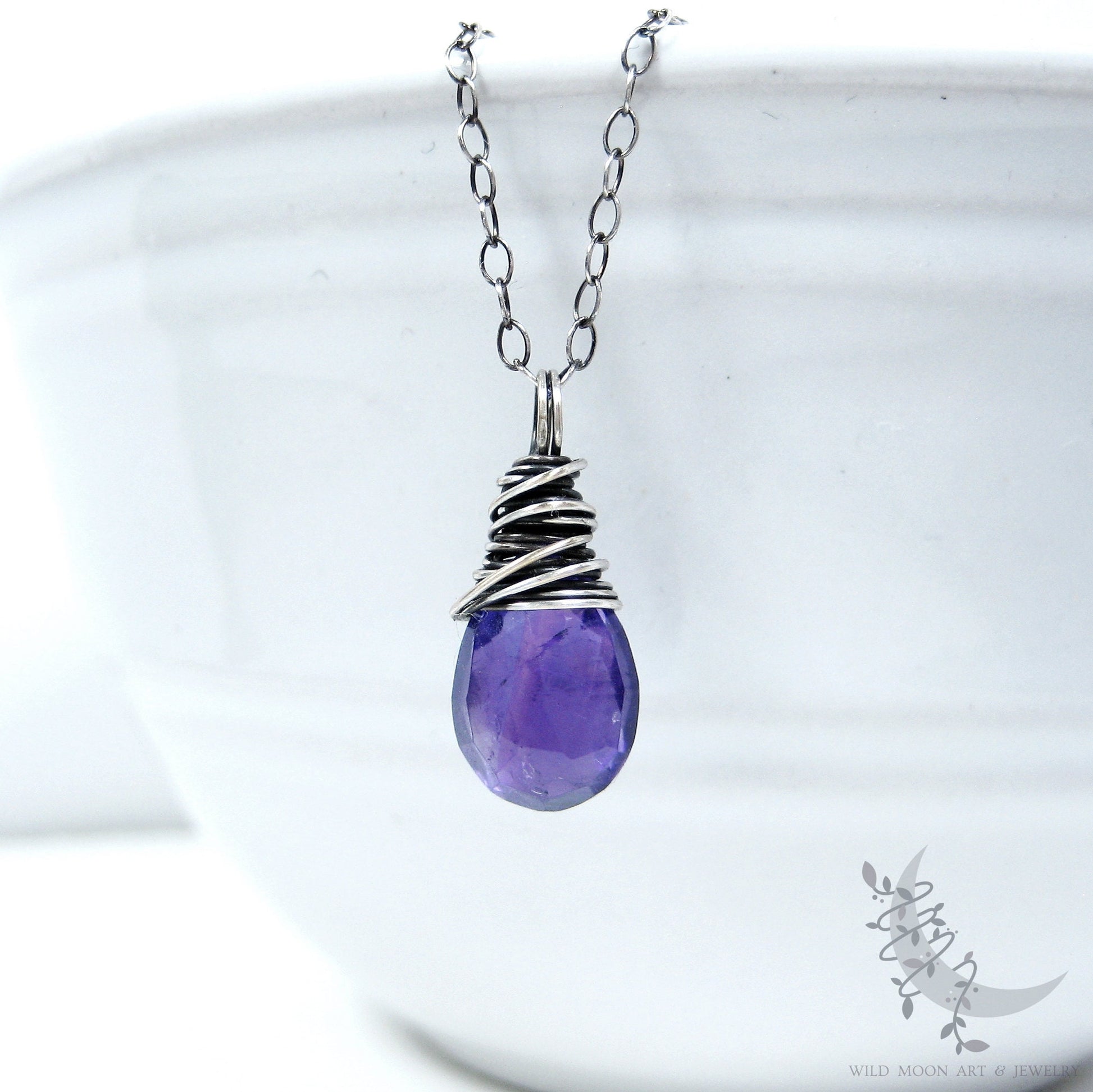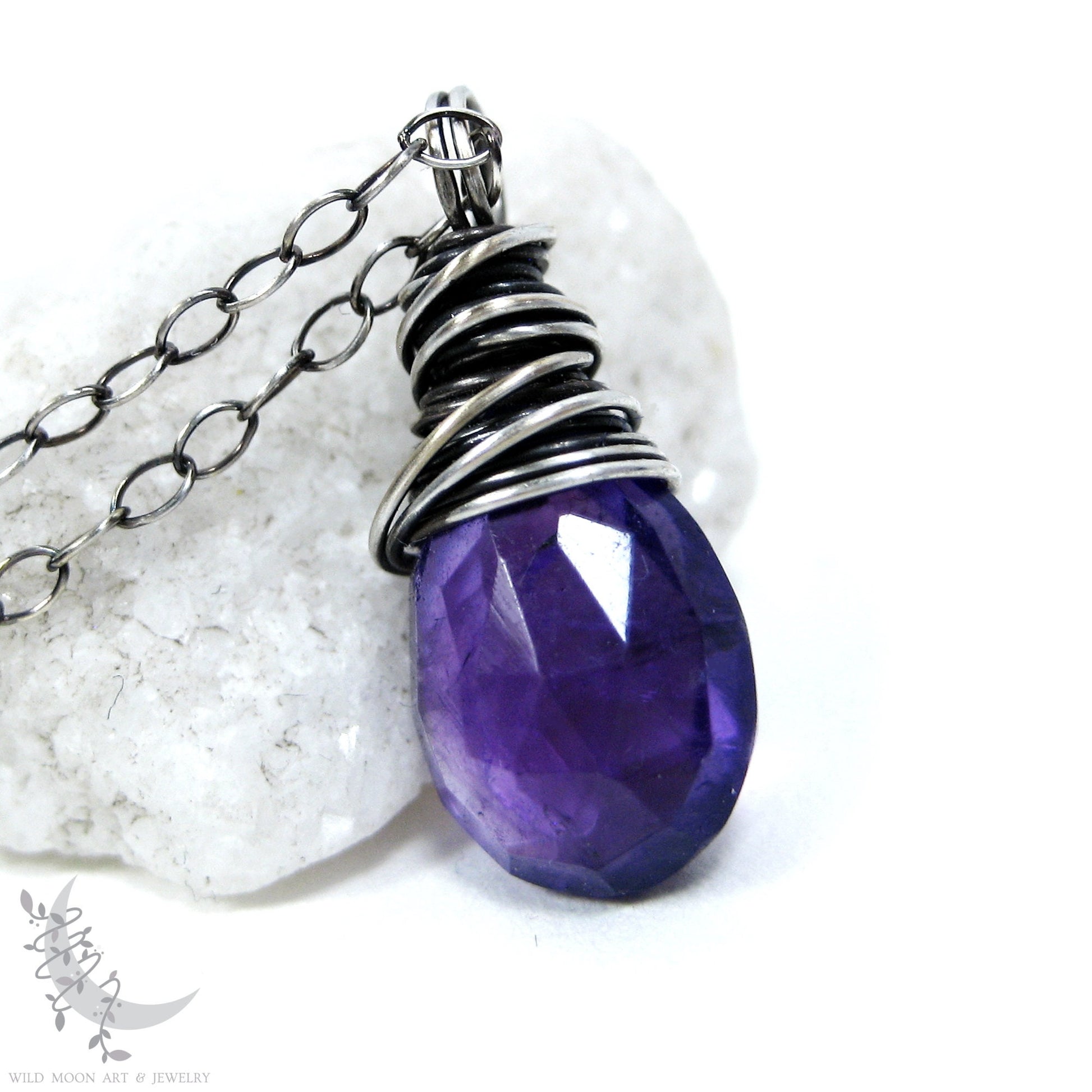 A petite, deep purple genuine amethyst gemstone is simply wire wrapped in sterling silver and fastened to a Sterling Silver chain. The ends of the chain are finished with two sterling silver faceted beads and a Sterling Silver spring ring clasp. The sterling silver in this piece has been oxidized (antiqued/aged) to a deep charcoal finish, then brushed and polished to bring out the silver highlights. This creates a natural, rustic finish with both shine and depth.