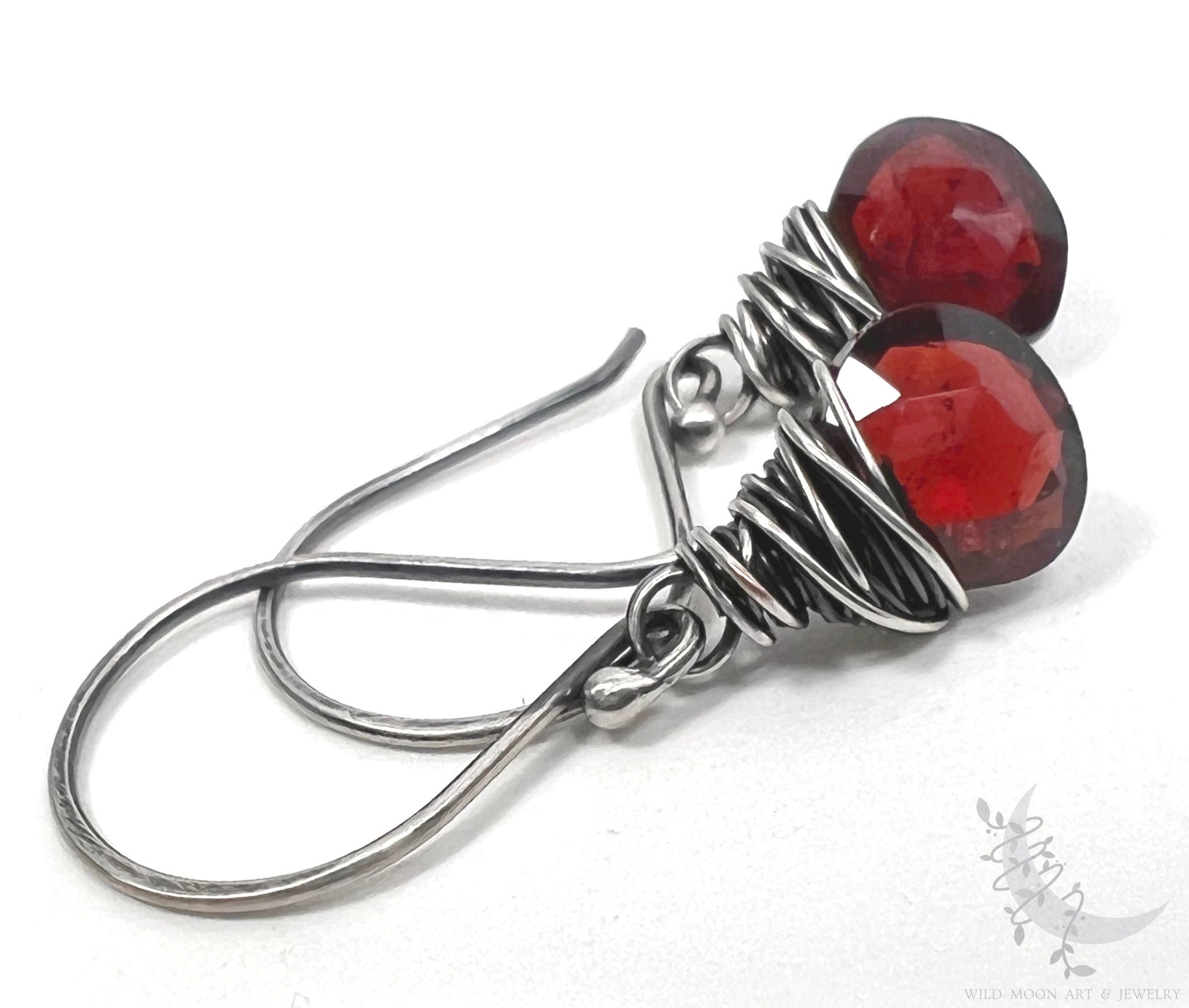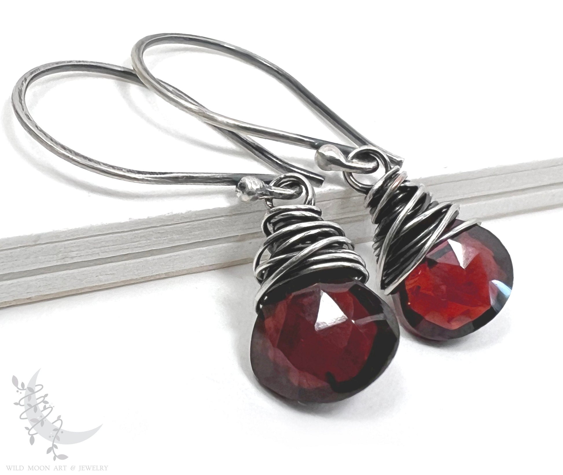 Dainty & red genuine garnet gemstones are wire wrapped in sterling silver and sway from handmade sterling silver ear wires. The sterling silver was oxidized (aged/antiqued) to a dark charcoal patina, then hand brushed and polished to bring out the silver highlights. This creates a natural, slightly rustic finish with both depth & shine.