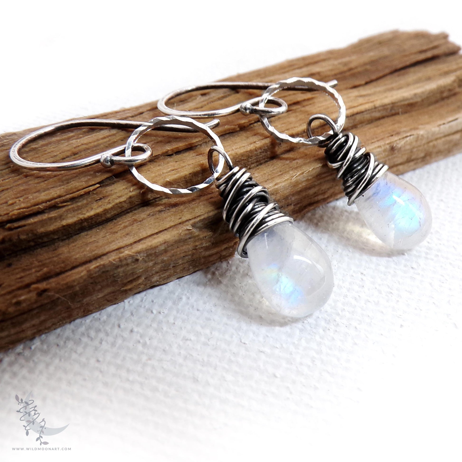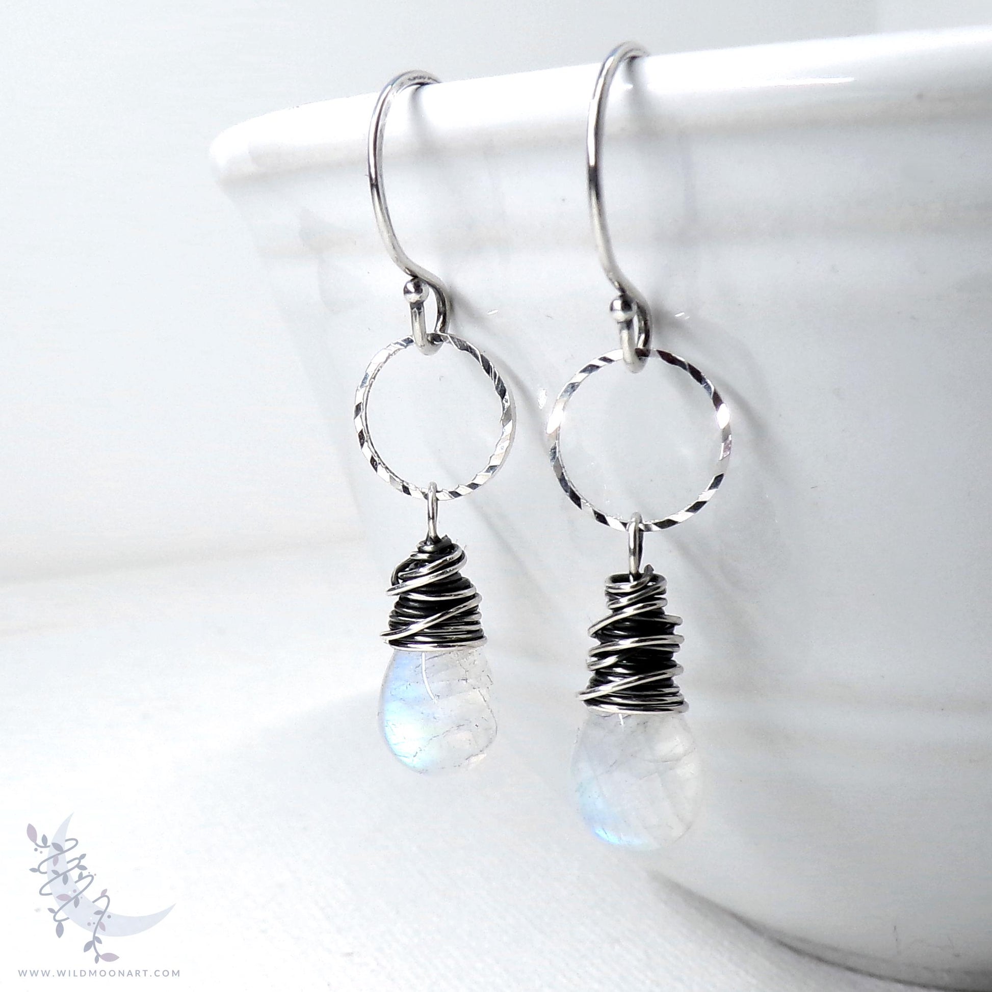 Petite genuine rainbow moonstone gemstones are wire wrapped in sterling silver & attached to diamond-cut Sterling Silver hoops. These sway from handmade sterling silver hook style ear wires. The sterling silver wire and ear wires have been oxidized (aged/antiqued) to a dark charcoal patina, then hand brushed and polished to bring out the silver highlights. This creates an organic, slightly rustic finish with both depth & shine.