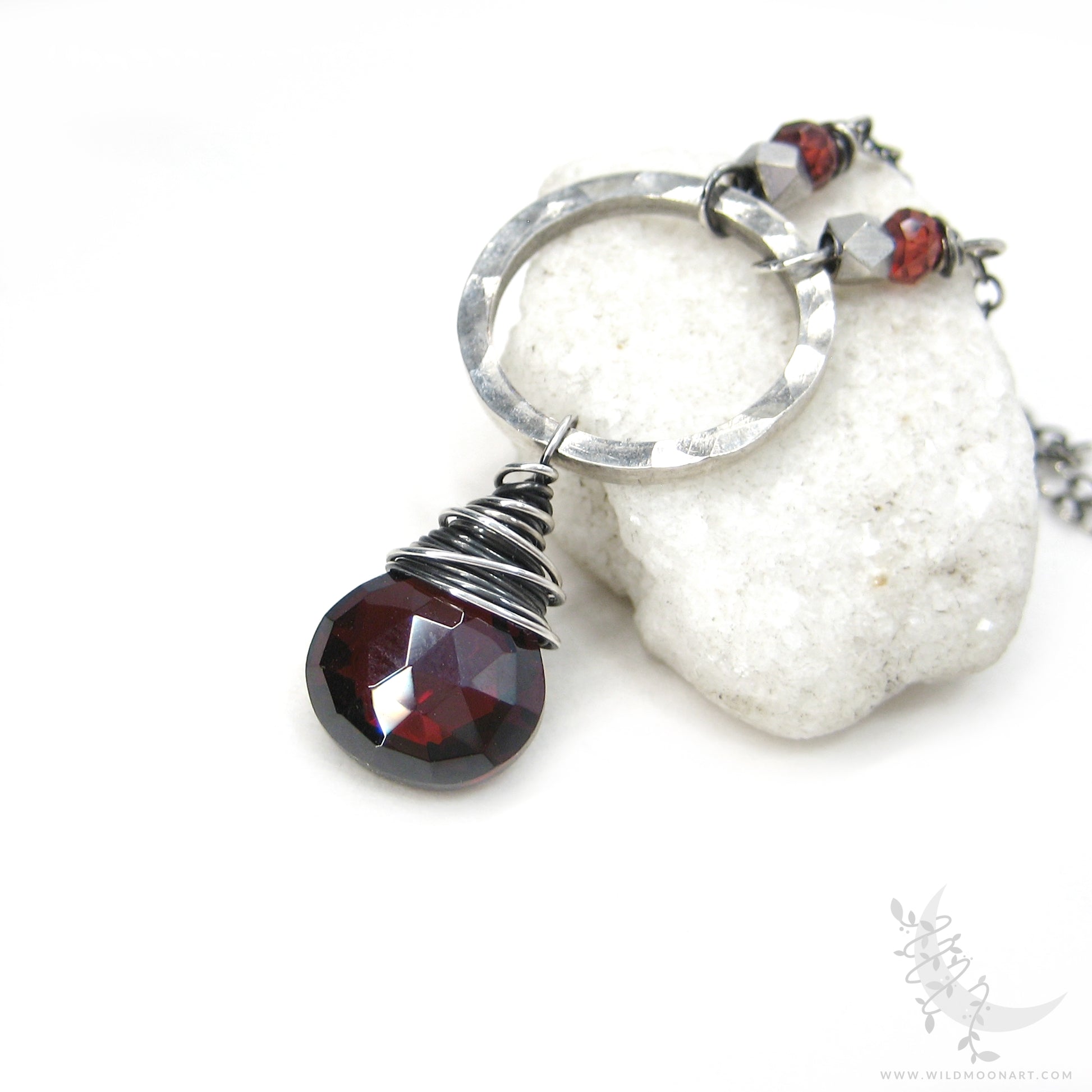 A single wine red genuine garnet gemstone has been wire wrapped in sterling silver and sways from a hand hammered silver circle. These are attached to a sterling silver chain via wire wrapped faceted garnet and silver beads. The chain is finished at the ends with two additional faceted sterling silver beads and a sterling silver spring-ring clasp.