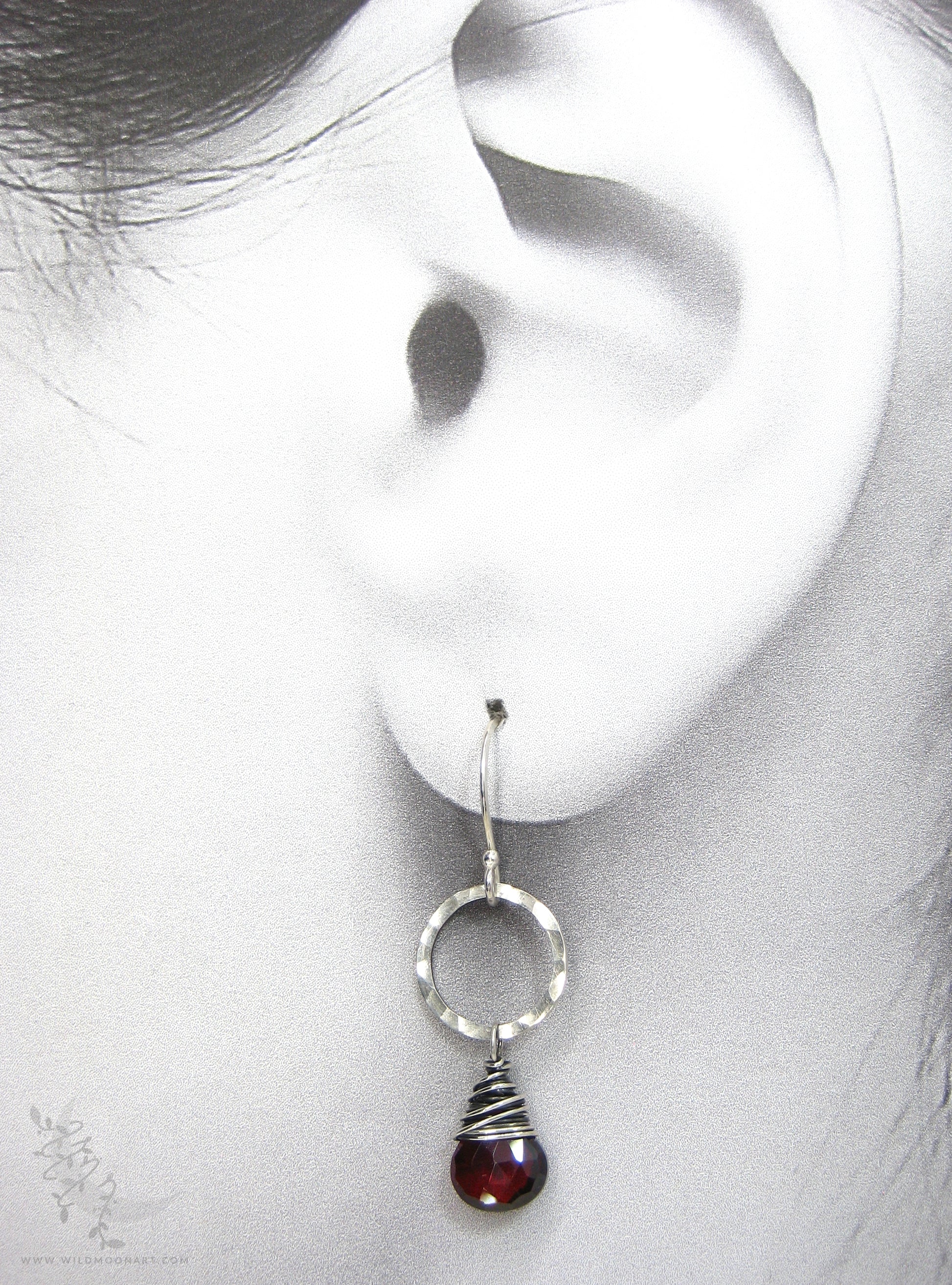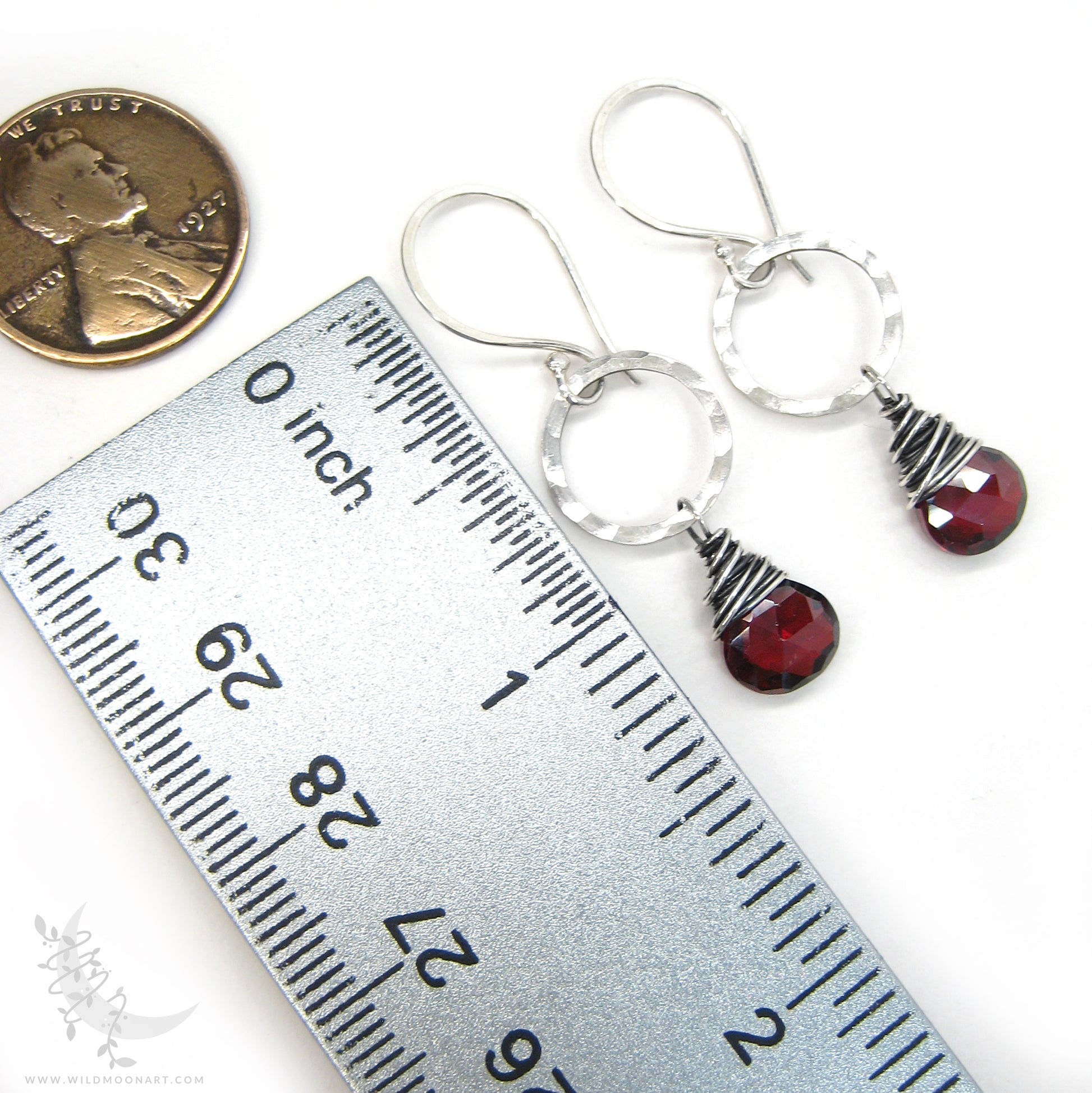 Dainty & deep red genuine garnet gemstones are wire wrapped in sterling silver and sway from hand hammered Sterling Silver circles & handmade sterling silver ear wires.