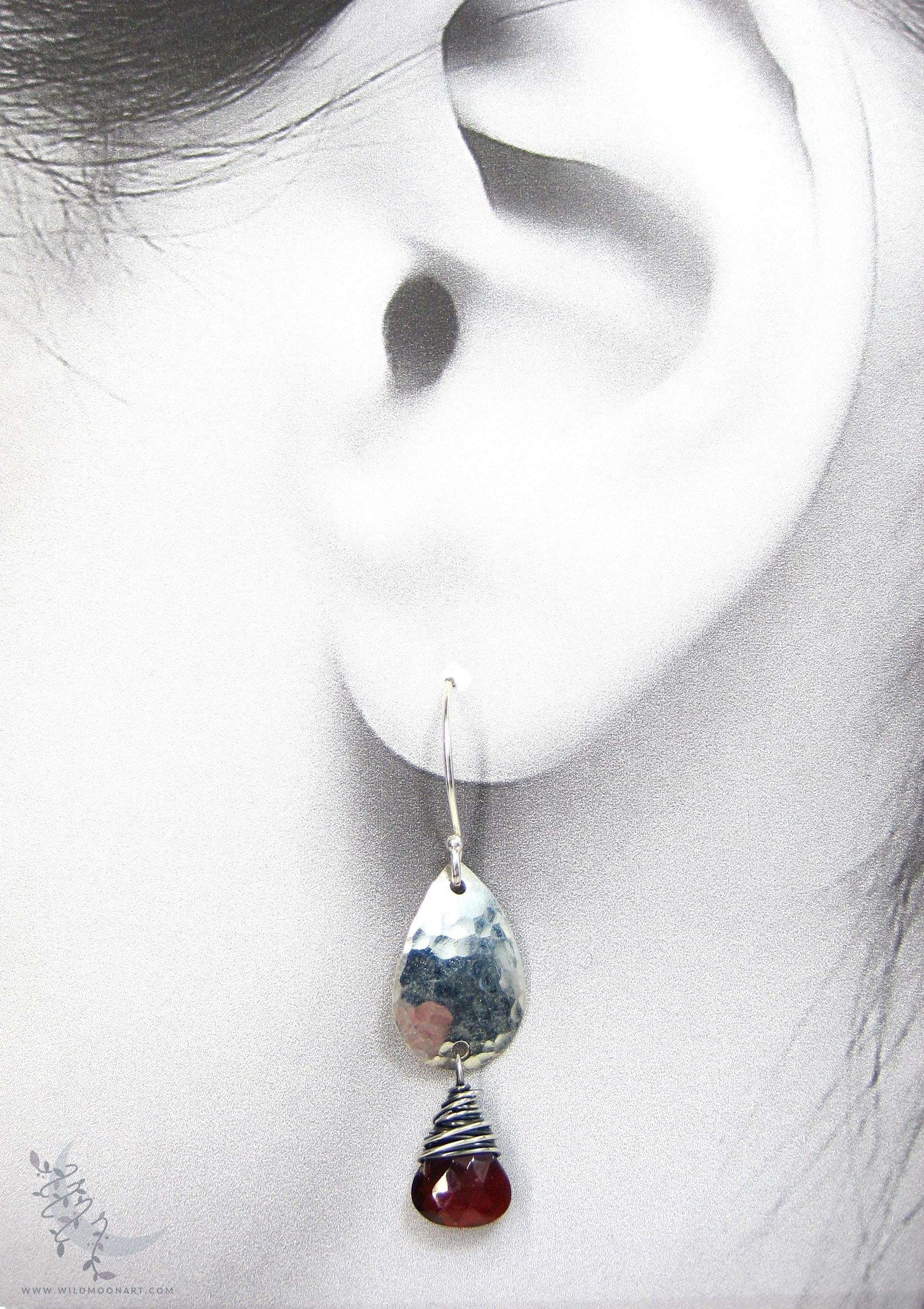 Dainty & red genuine garnet gemstones are wire wrapped in sterling silver and sway from hand hammered Sterling Silver teardrops & handmade sterling silver ear wires. The sterling silver wire was oxidized (aged/antiqued) to a dark charcoal patina, then hand brushed and polished to bring out the silver highlights. This creates a natural, slightly rustic finish with both depth & shine. The ear wires and teardrops are a bright & shiny finish.