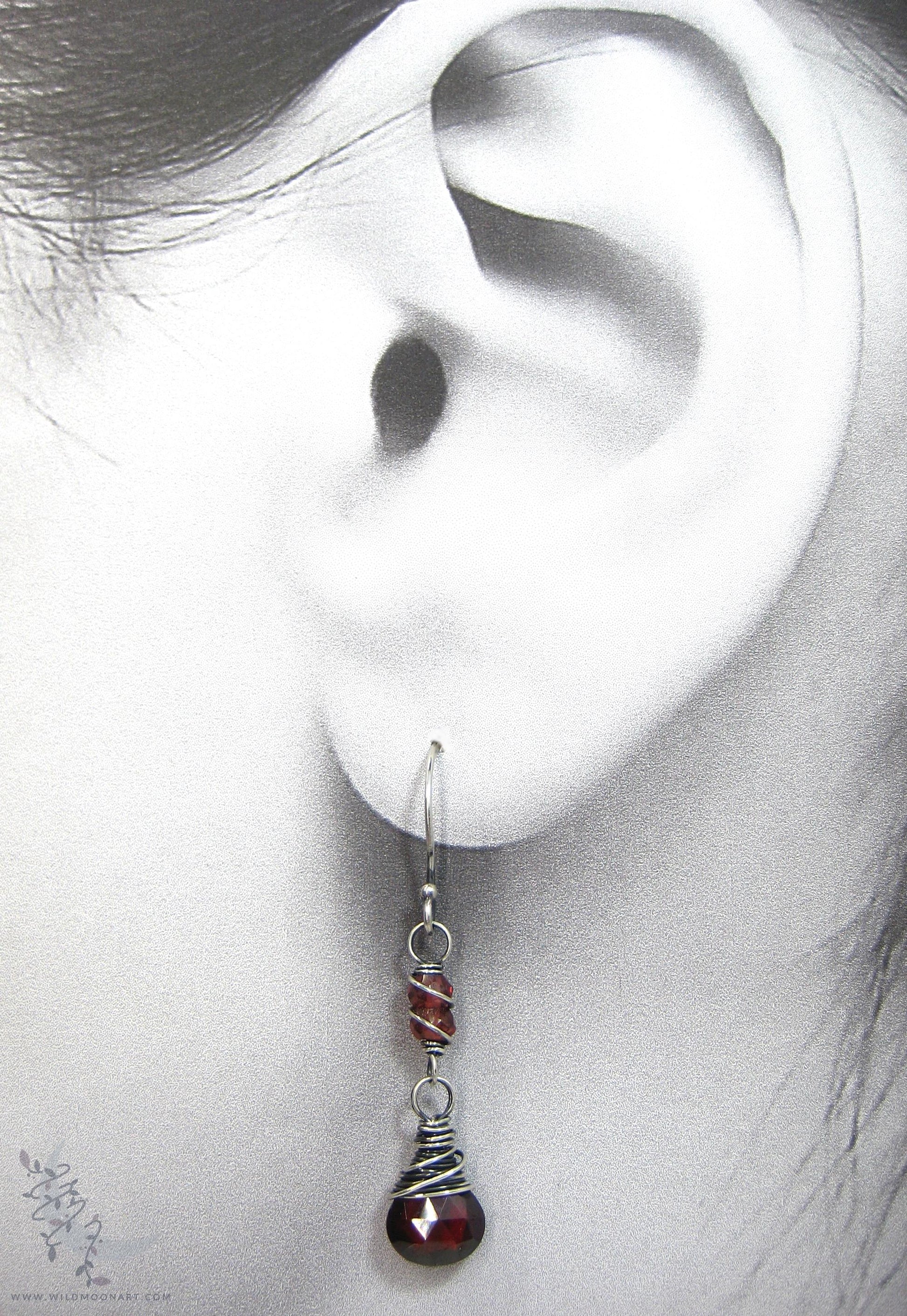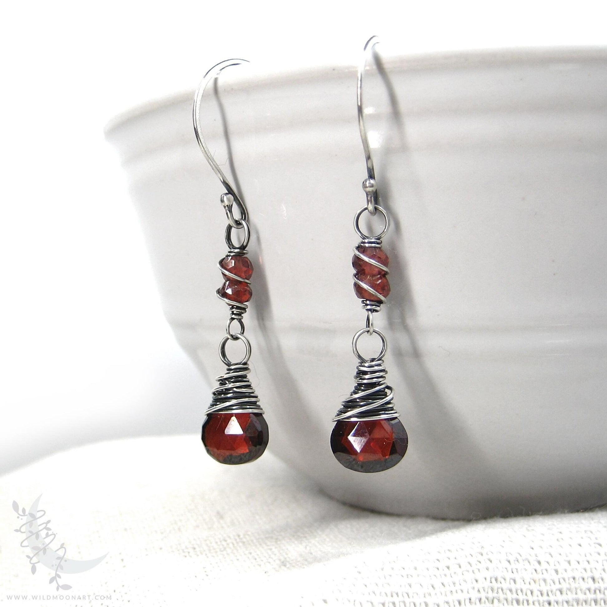 Dainty & red genuine garnet gemstones are wire wrapped in sterling silver and sway from handmade sterling silver ear wires. The sterling silver wire was oxidized (aged/antiqued) to a dark charcoal patina, then hand brushed and polished to bring out the silver highlights. This creates a natural, slightly rustic finish with both depth & shine.