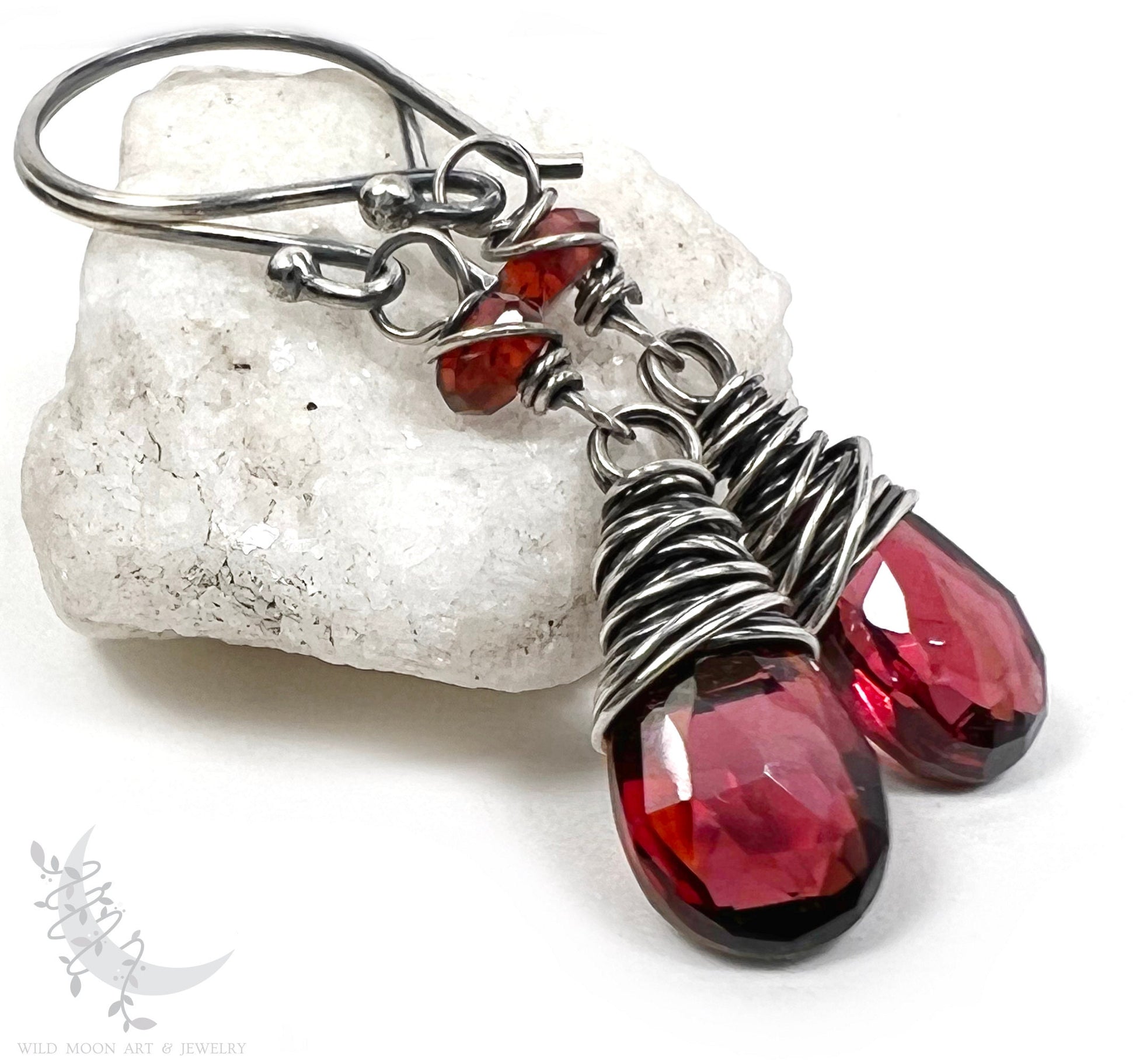 Dainty genuine garnet gemstones are wire wrapped in sterling silver and sway from handmade sterling silver ear wires. The sterling silver was oxidized to a deep charcoal patina, then hand brushed and polished to bring out the silver highlights. This creates an organic, slightly rustic finish with both depth & shine.