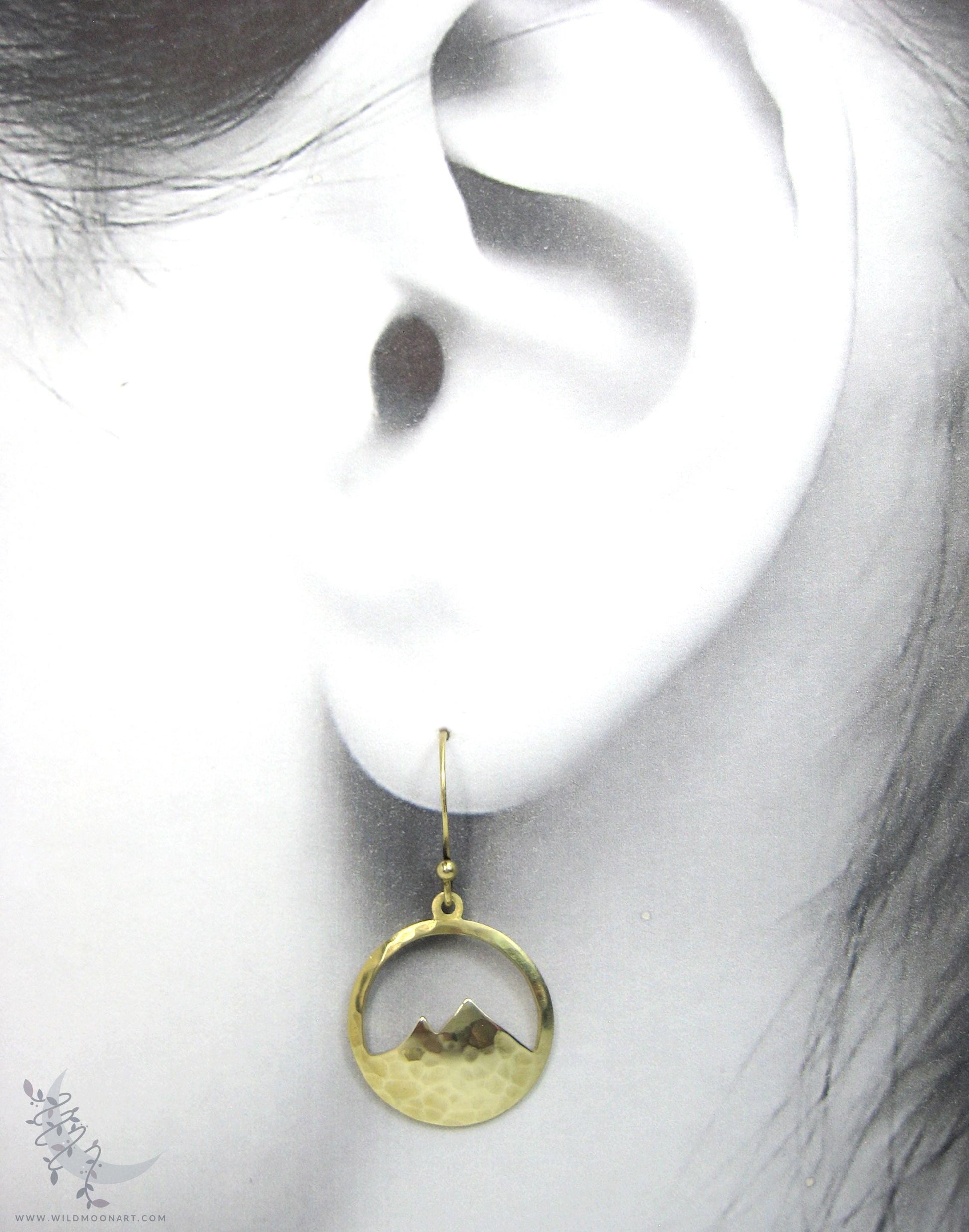 Small raw brass discs, cut to mountain shapes, have been hand hammered for texture and formed into a gentle convex shape. The hammered mountain discs are suspended from handmade solid raw brass ear wires. The golden raw brass is Jeweler's Brass composed of 67% copper and 33% Zinc - Lead and Nickel free.