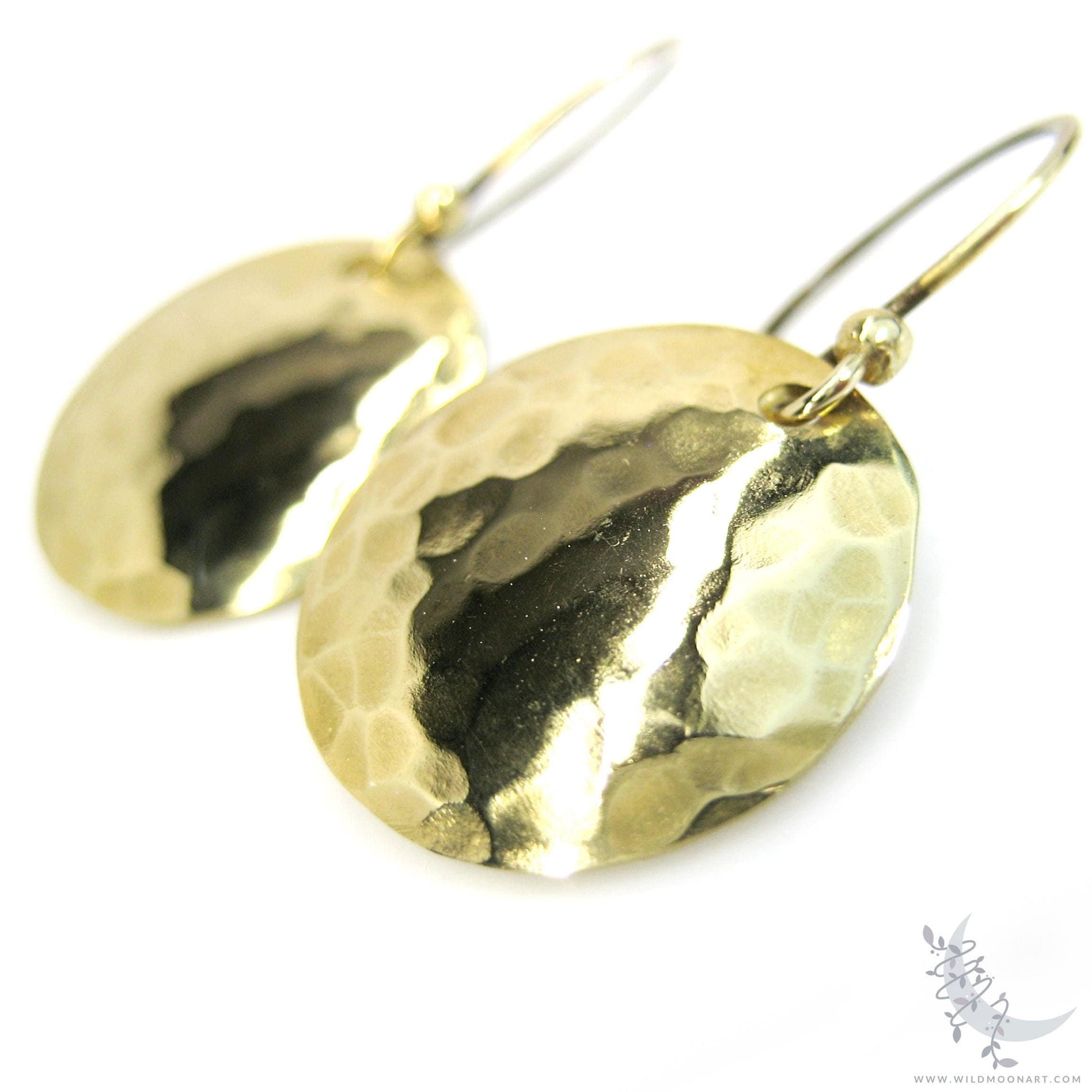 Pure, raw brass coins were hand hammered for texture and formed into a gentle convex shape. The hammered discs are suspended from handmade solid raw brass ear wires.