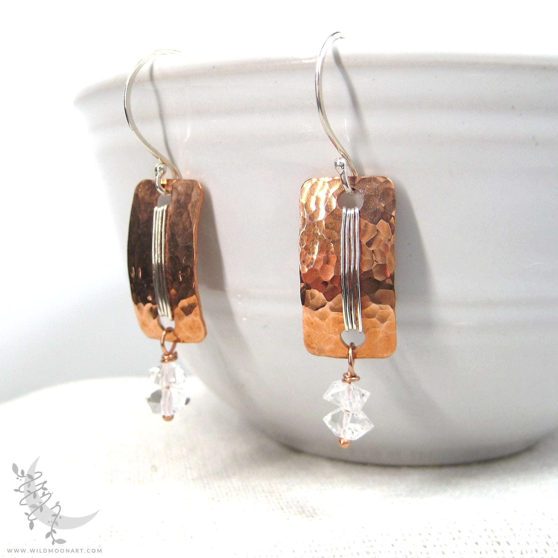 Herkimer Diamond Copper Earrings · Hammered Mixed Metal Sterling Silver Rectangle Dangle