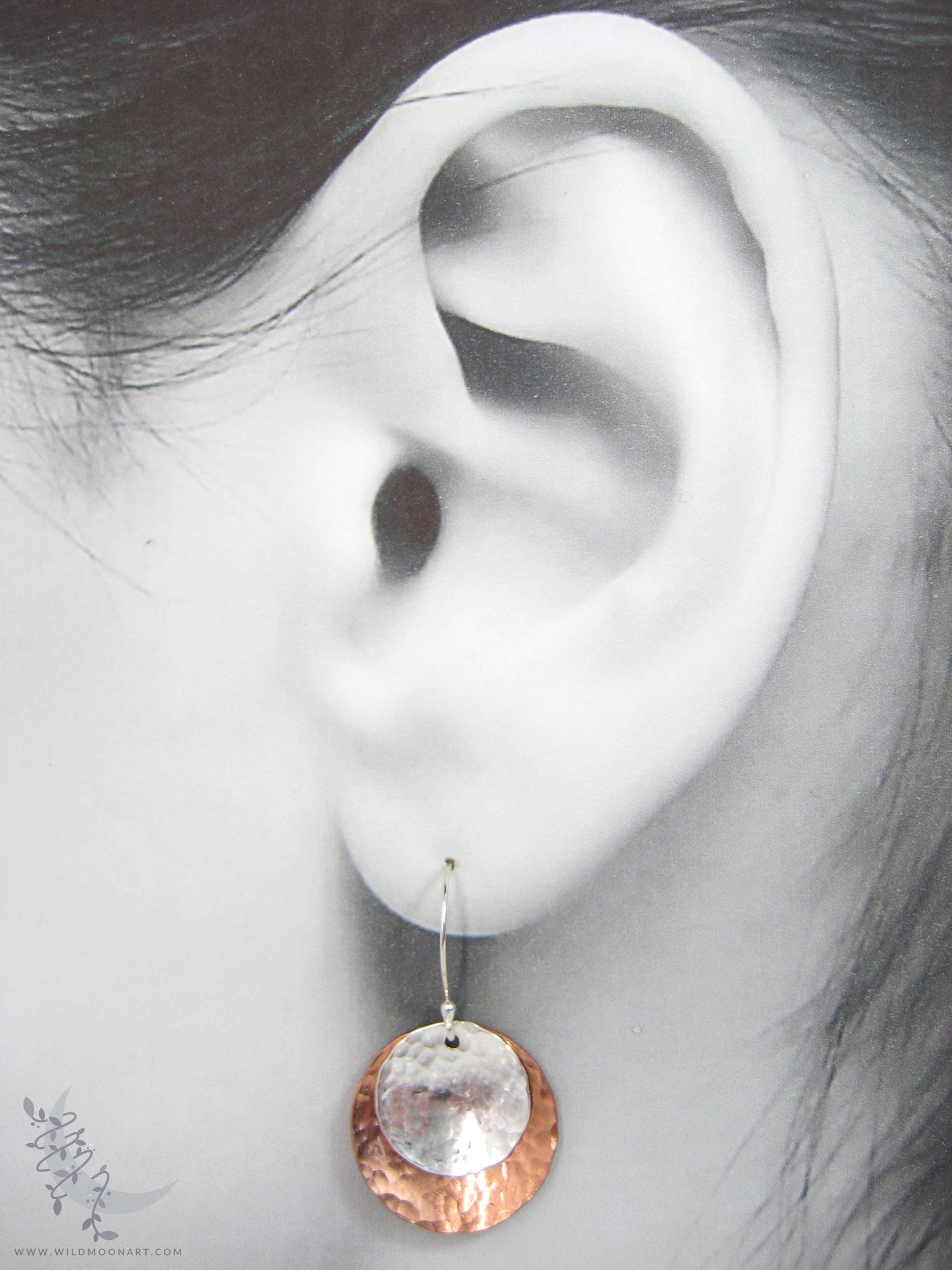 Raw copper & Sterling Silver coins were hand hammered for texture and formed into a gentle concave shape. The hammered discs are suspended from handmade solid .925 Sterling Silver ear wires. The Sterling Silver used in making the earrings is recycled; made from scrap and re-torched to form & shape. The raw copper is pure copper and the Sterling Silver is .925 silver.