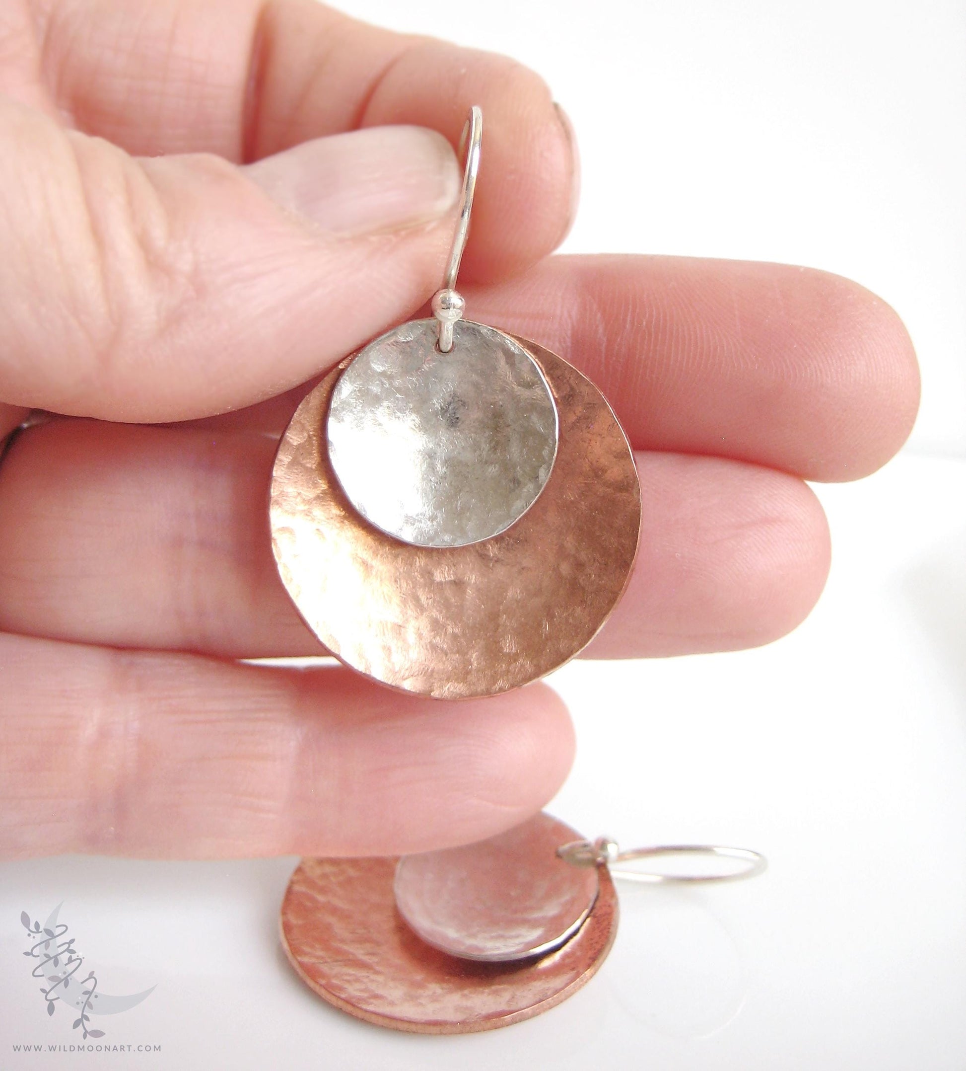 Mixed Metal Handmade Hammered Raw Copper & Sterling Silver Large Coin Disc Earrings ·