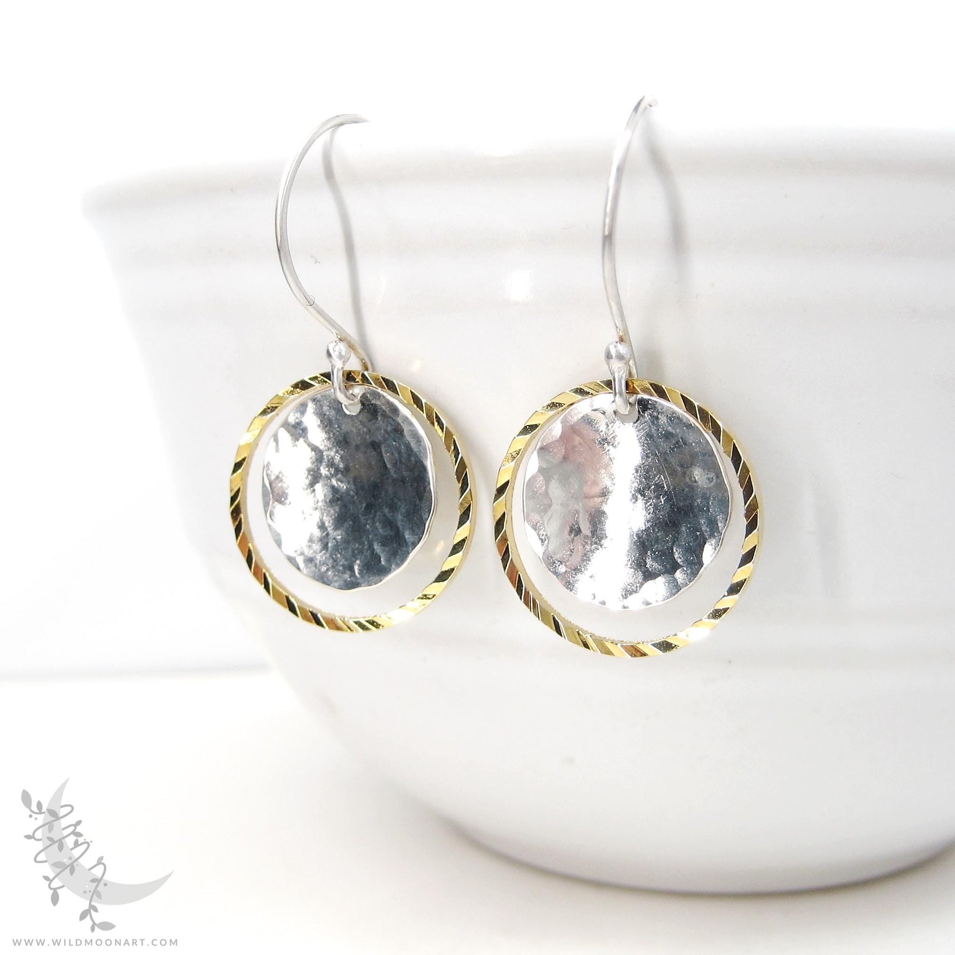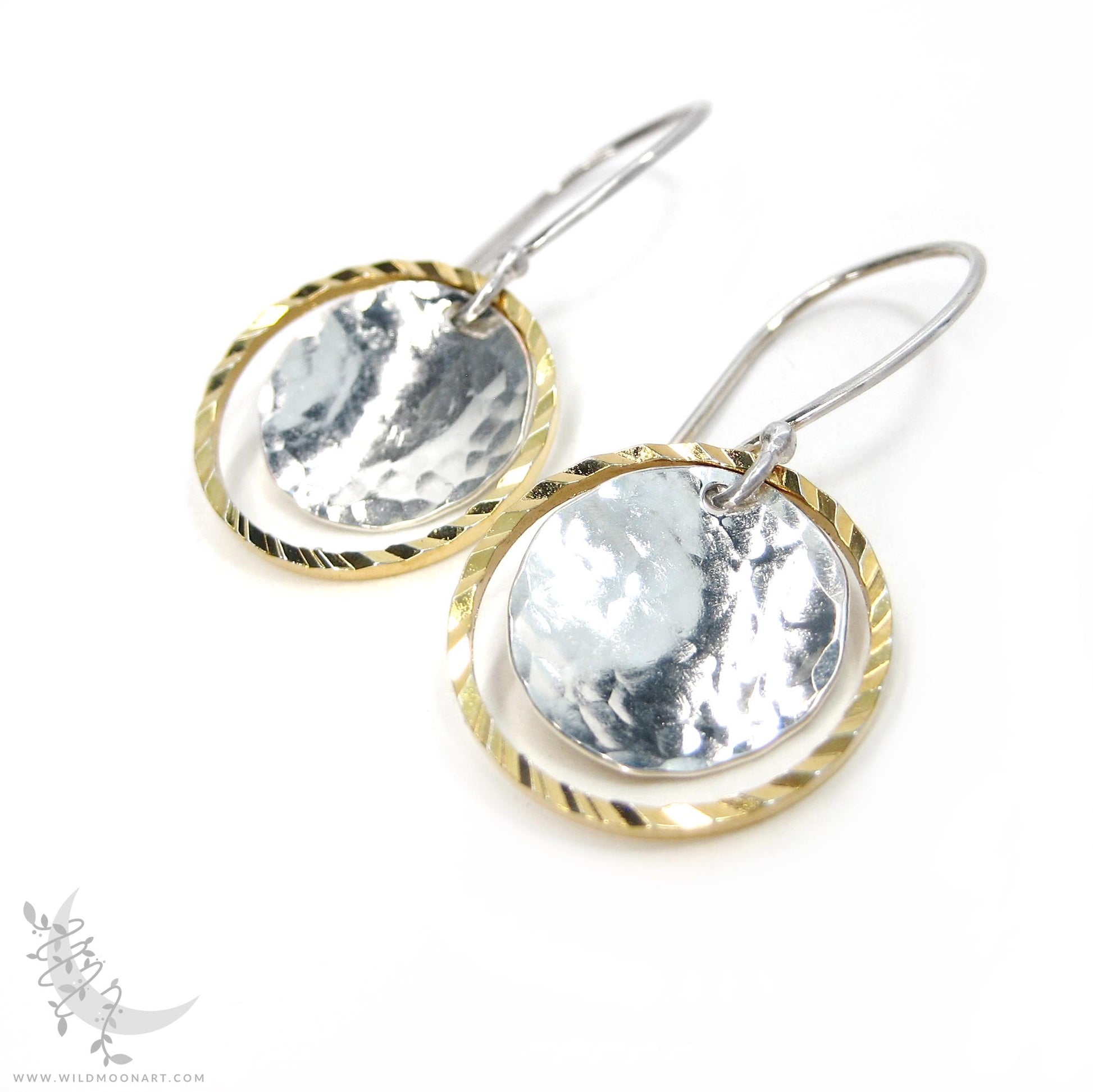 These Sterling Silver discs were hand hammered, formed and shaped in gentle concave discs and paired with diamond-cut 14k Gold Fill open rings. The metal discs were then brushed & polished for shine and suspended from handmade hook style Sterling Silver ear wires.