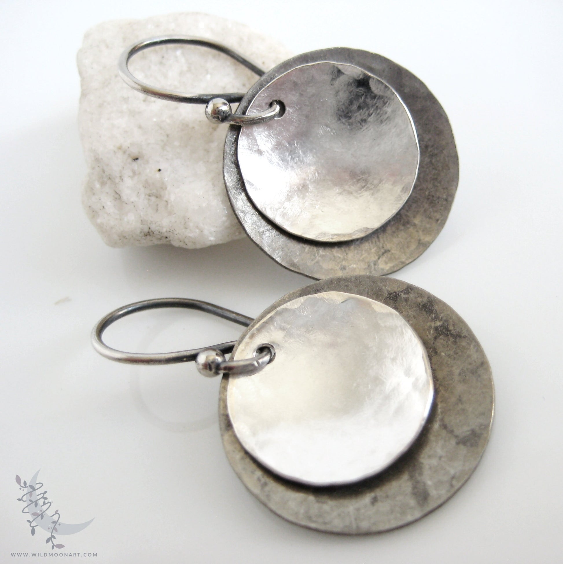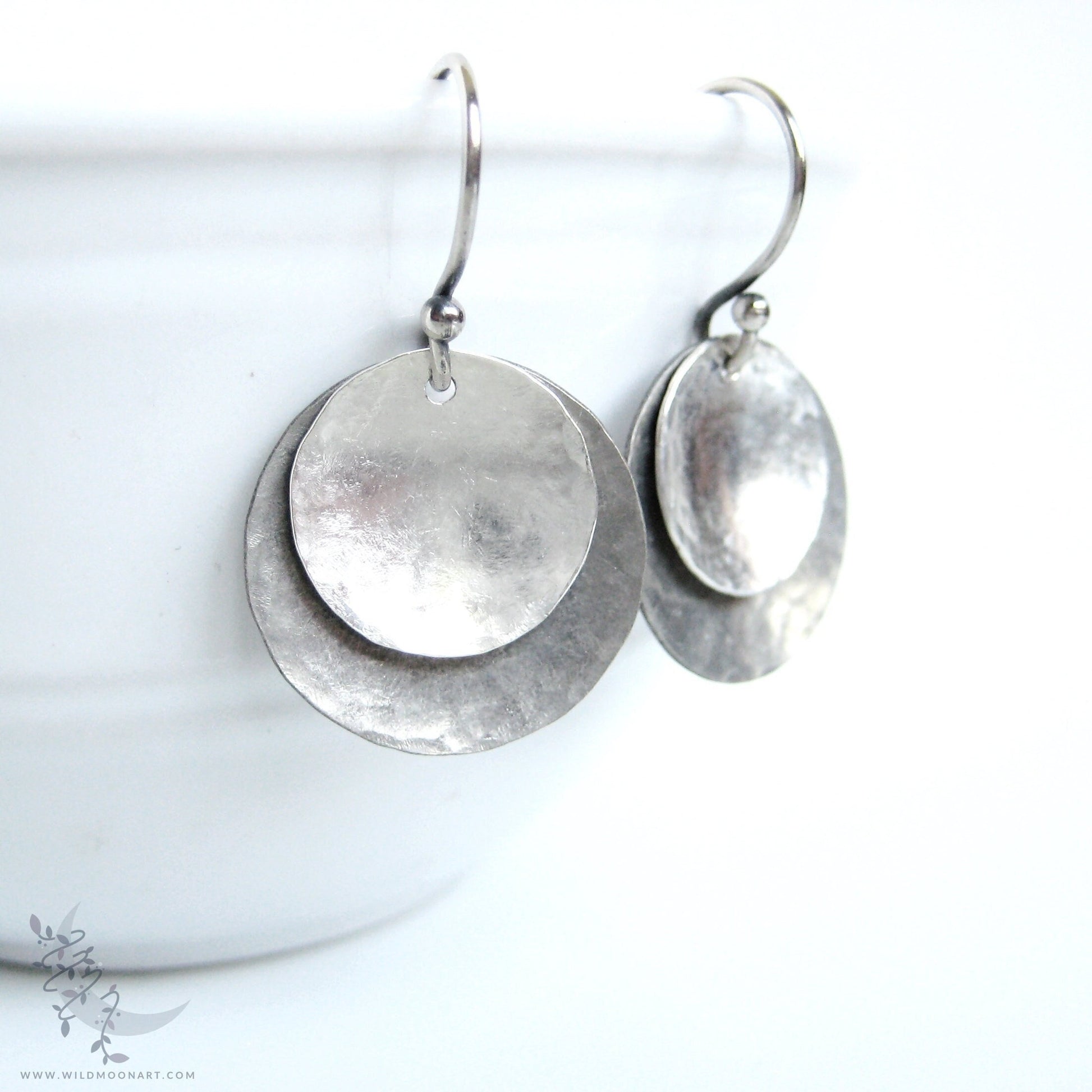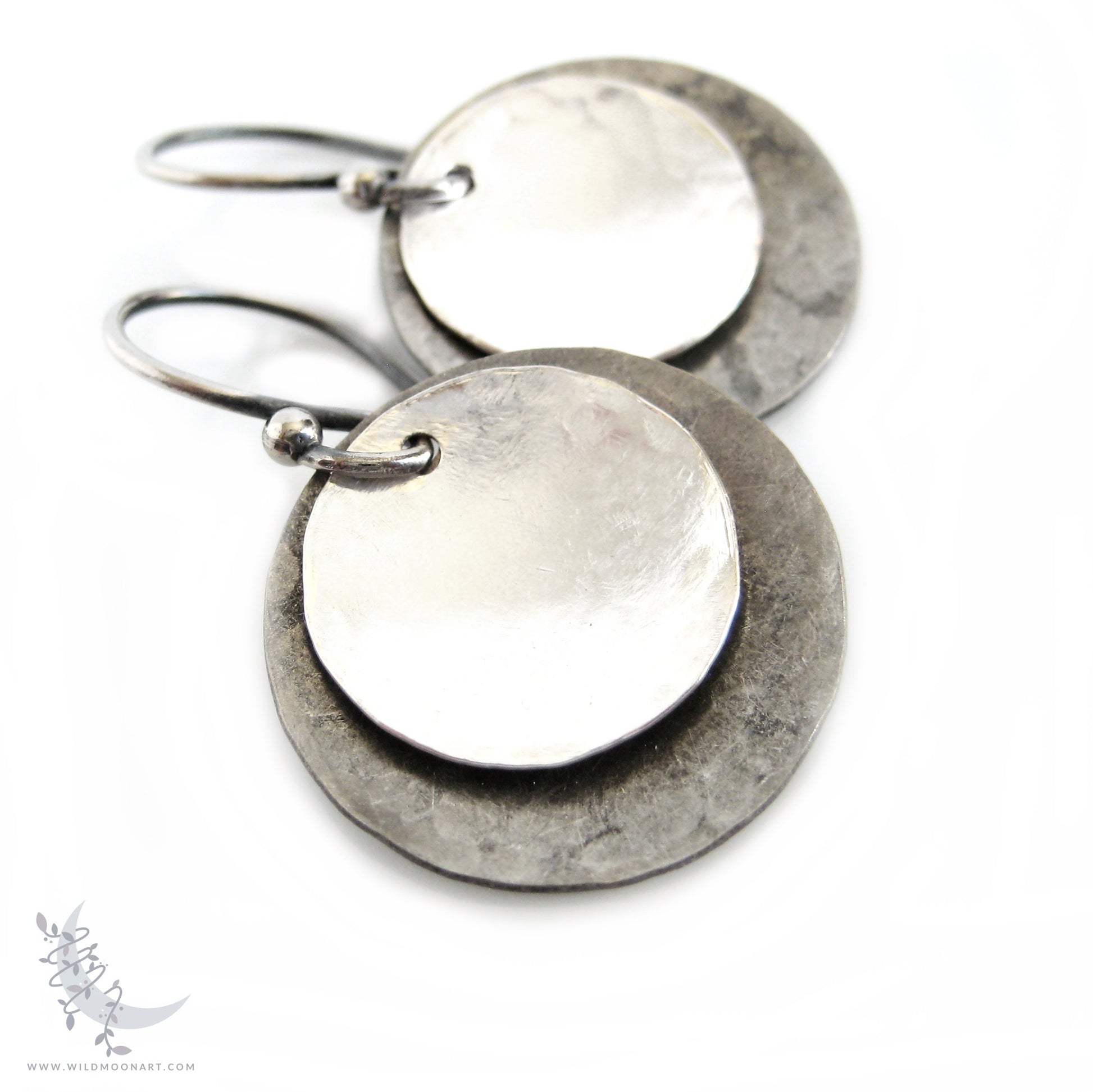 Medium Shiny & Oxidized (Antiqued) Sterling Silver coins were hand hammered for texture, formed and shaped in gentle concave discs, then suspended from handmade solid .925 Sterling Silver hook style ear wires. The Sterling Silver used in making the earrings is recycled; made from scrap and re-torched to form & shape. The silver for the larger discs has been oxidized to a dark charcoal patina and brushed and polished for a rustic look with a matte, darkened finish. The smaller discs are both matte and shiny bright silver.