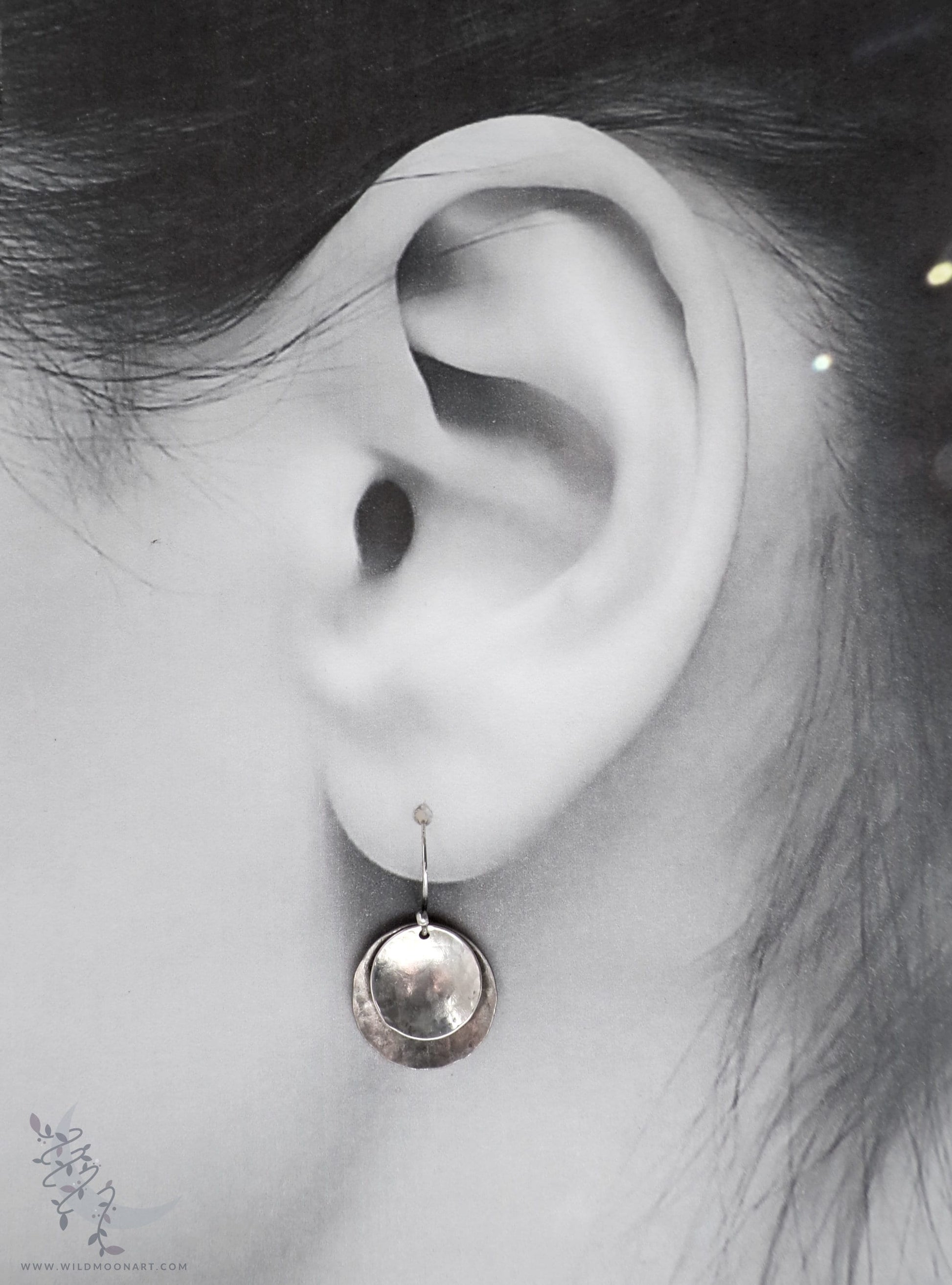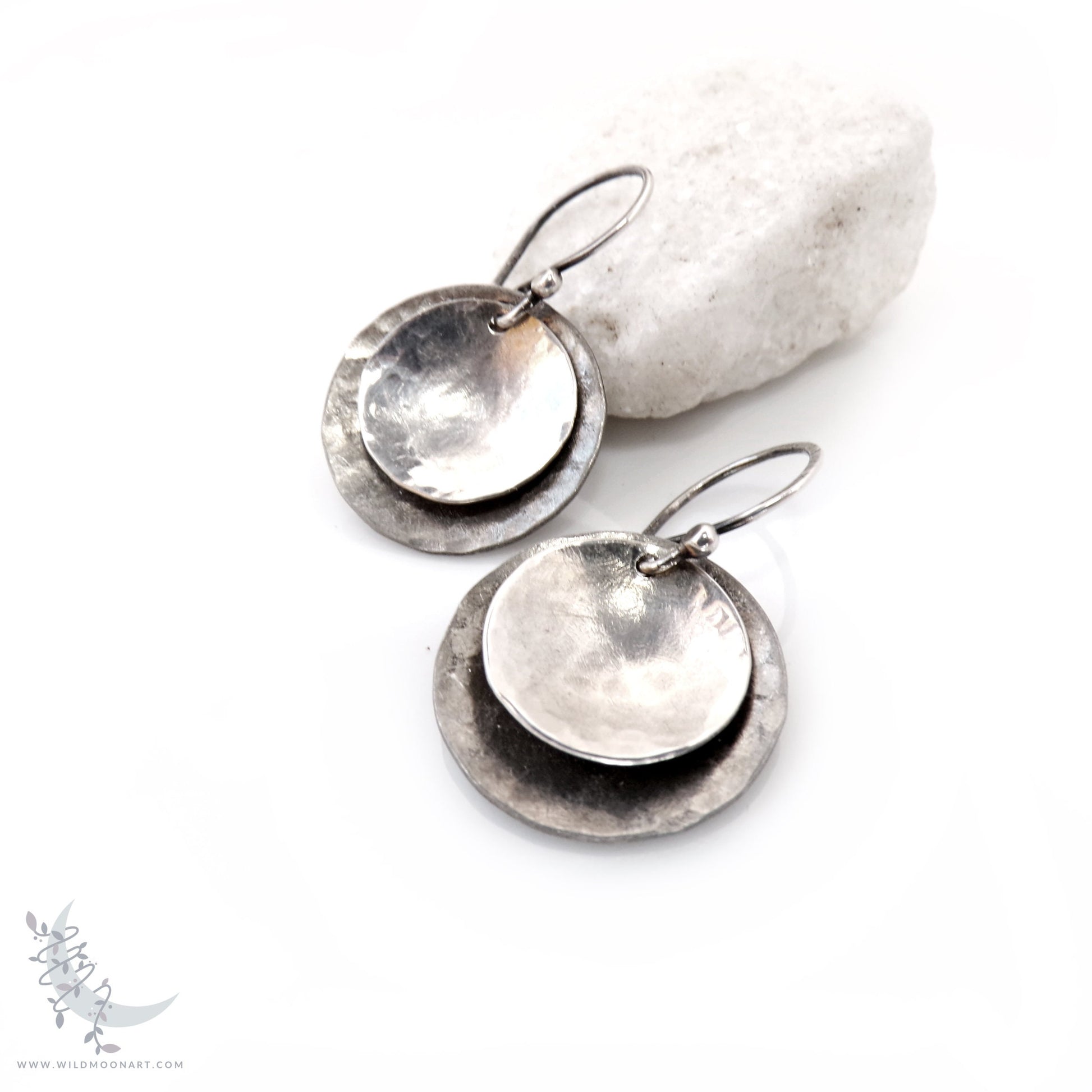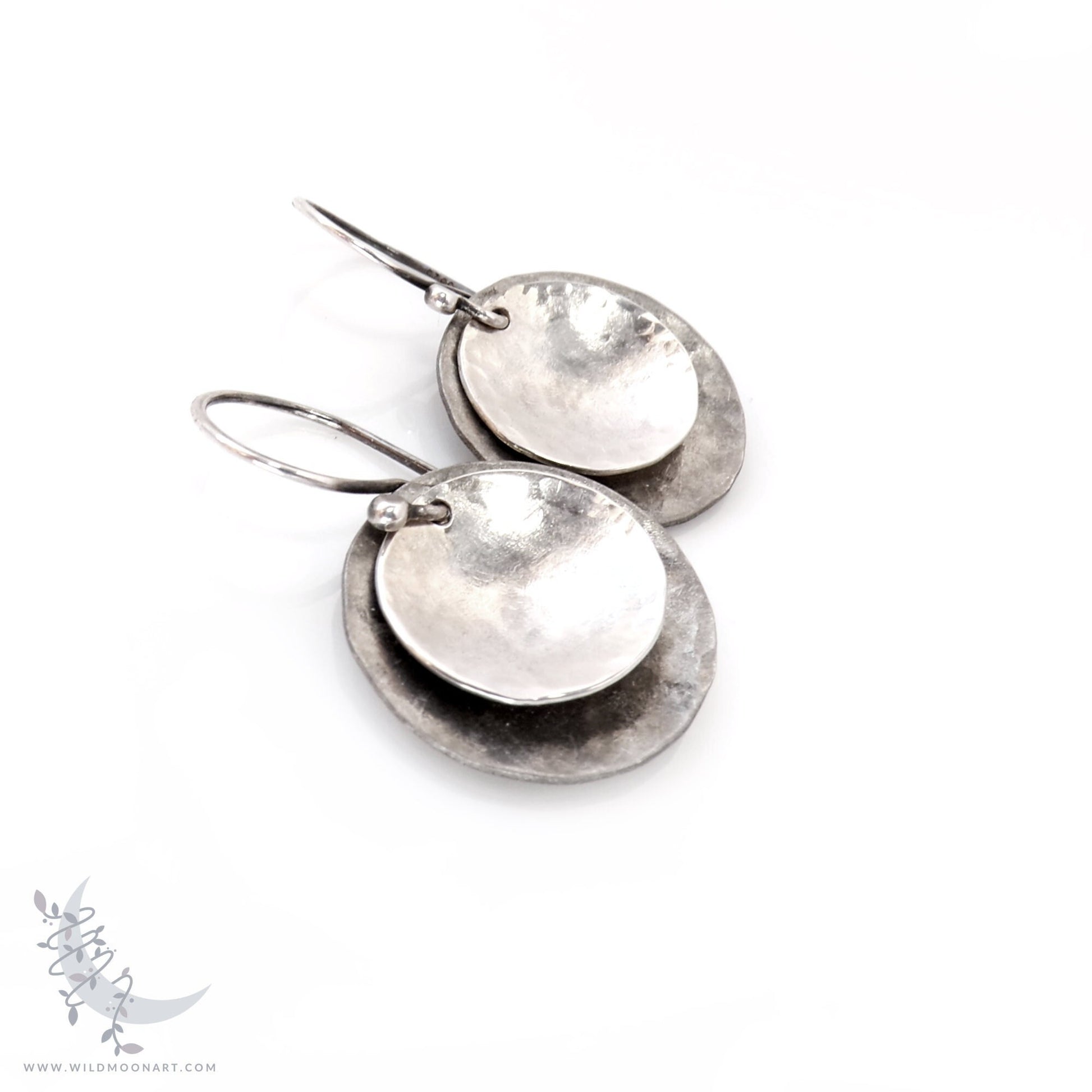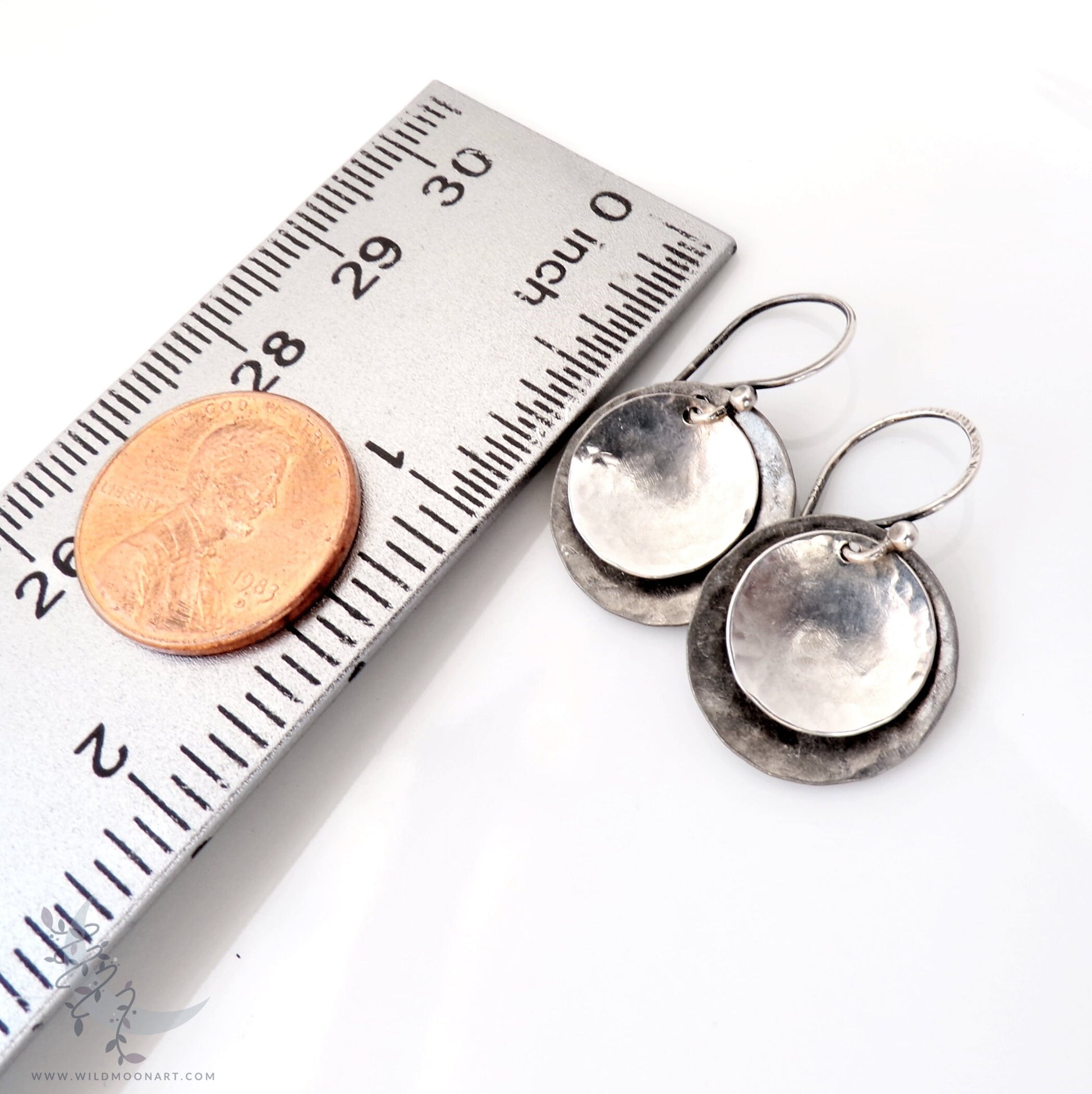 Shiny & Oxidized (Antiqued) Sterling Silver coins were hand hammered for texture, formed and shaped in gentle concave discs, then suspended from handmade solid .925 Sterling Silver hook style ear wires. The Sterling Silver used in making the earrings is recycled; made from scrap and re-torched to form & shape. The silver for the larger discs has been oxidized to a dark charcoal patina and brushed and polished for a rustic look with a matte, darkened finish. The smaller discs are both matte and shiny bright silver.