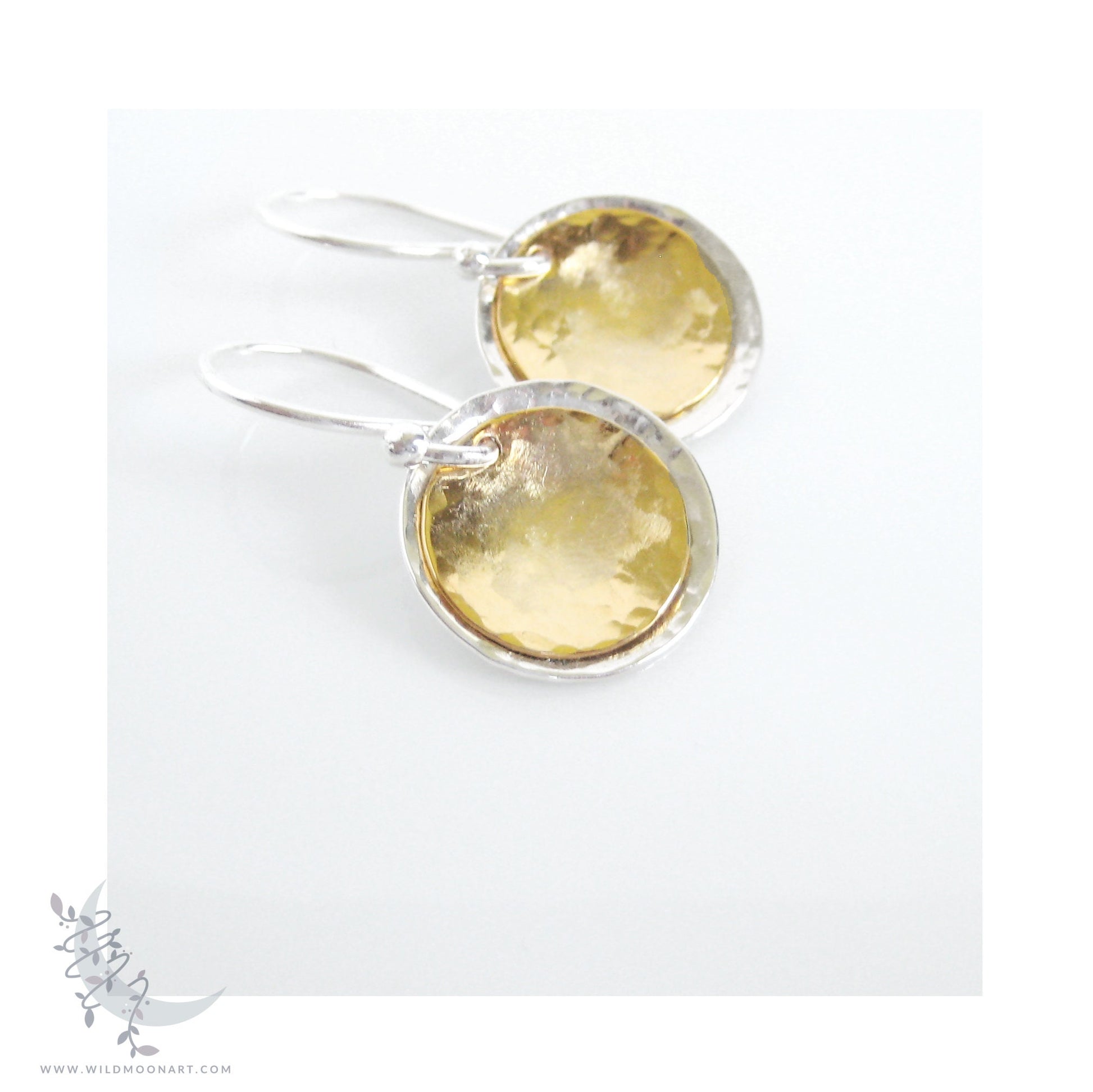 Lunar Eclipse · These Sterling Silver & 14k Gold Filled discs were hand hammered for texture and formed into a gentle concave shape. The metal discs were then brushed & polished for shine and suspended from handmade Sterling Silver ear wires.