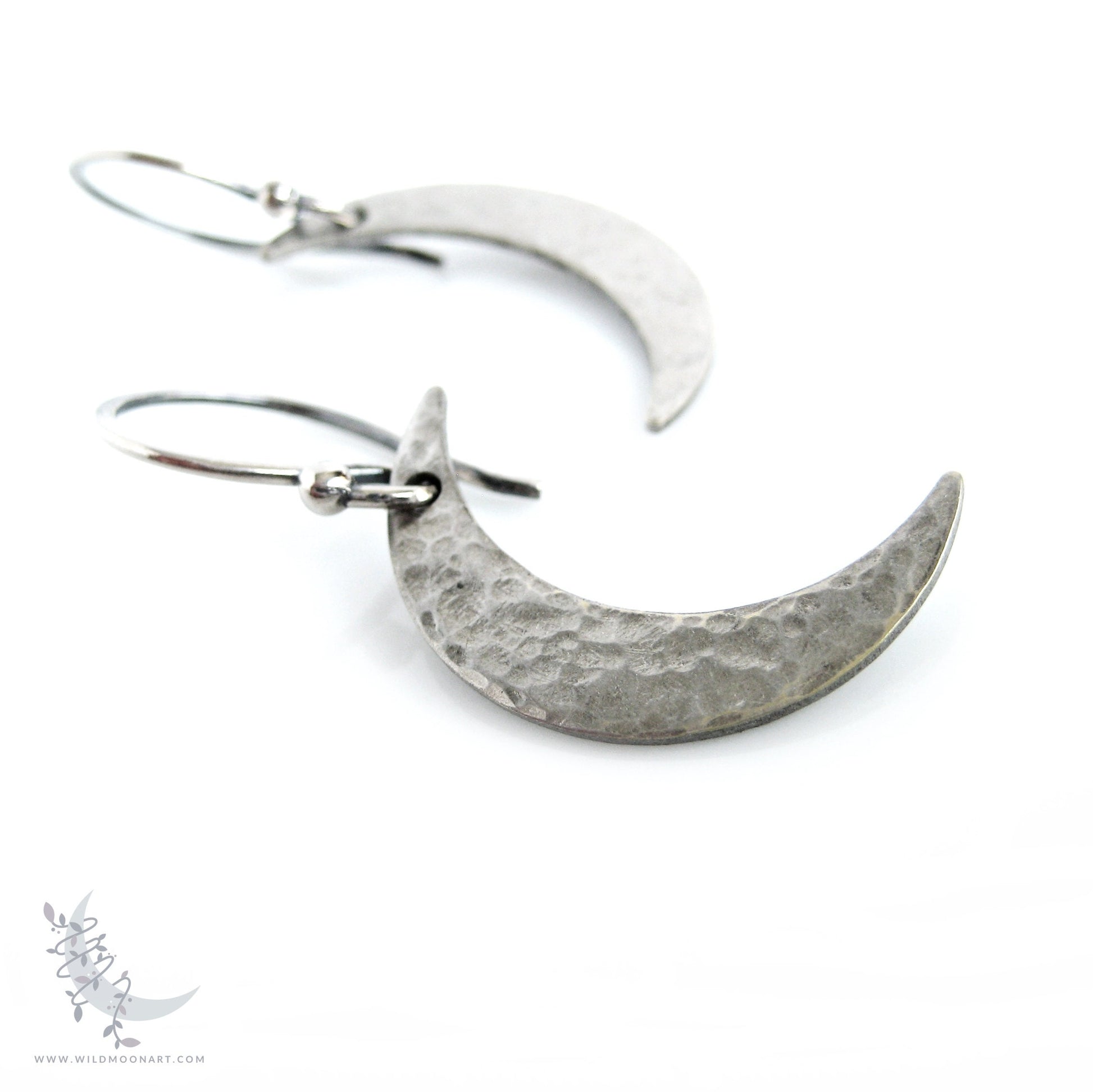 Antiqued silver crescent moons are hand hammered for texture, formed & shaped, and sway from handmade solid .925 Sterling Silver ear wires. The silver filled moons and Sterling Silver ear wires are oxidized (aged/antiqued) to a dark charcoal patina, then brushed and polished to bring out the shiny highlights. This creates a pleasing finish with depth and a rustic feel, and adds wonderful texture to the moons.