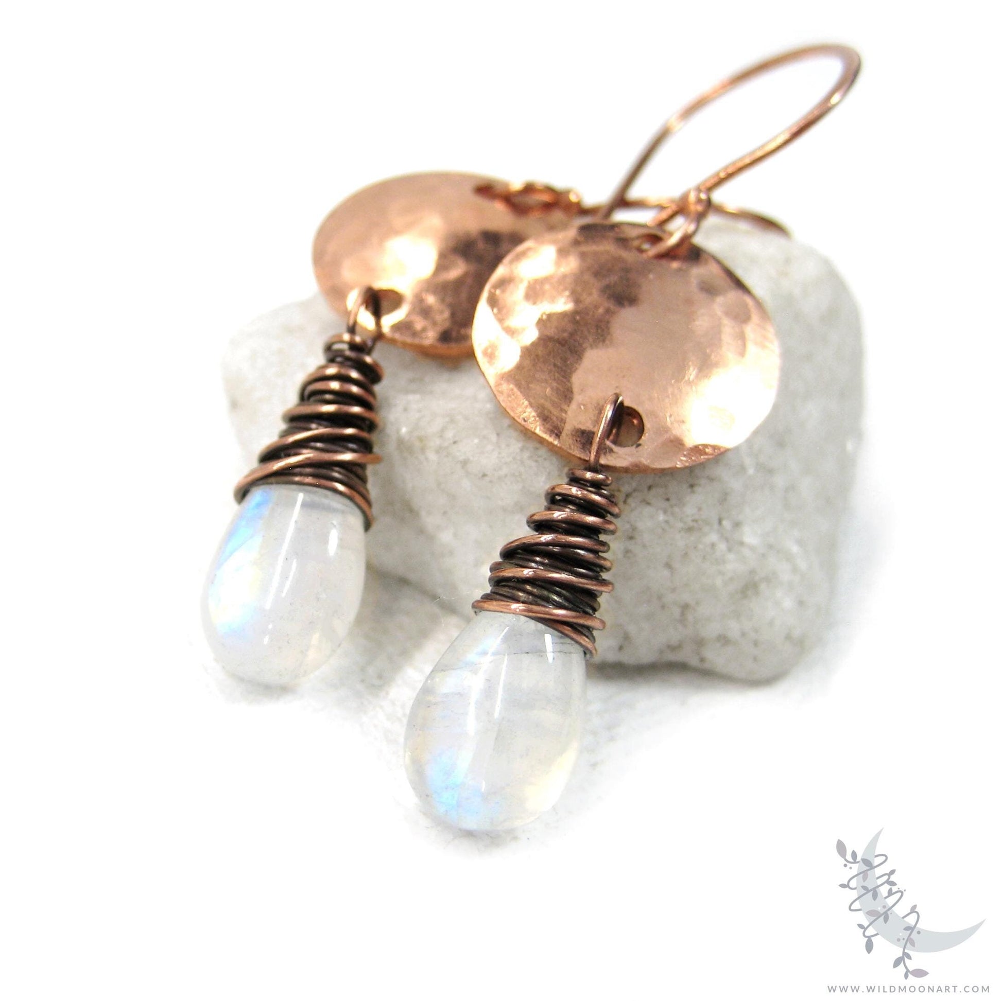 Petite genuine rainbow moonstone gemstones are wire wrapped in antiqued raw copper & attached to hand hammered raw copper discs. These sway from handmade raw copper hook style ear wires. I oxidized (aged/antiqued) the pure copper wire to a dark charcoal patina, then hand brushed and polished to bring out the shiny highlights. This creates an organic, slightly rustic finish with both depth & shine. The ear wires and hammered coins are shiny pure copper.