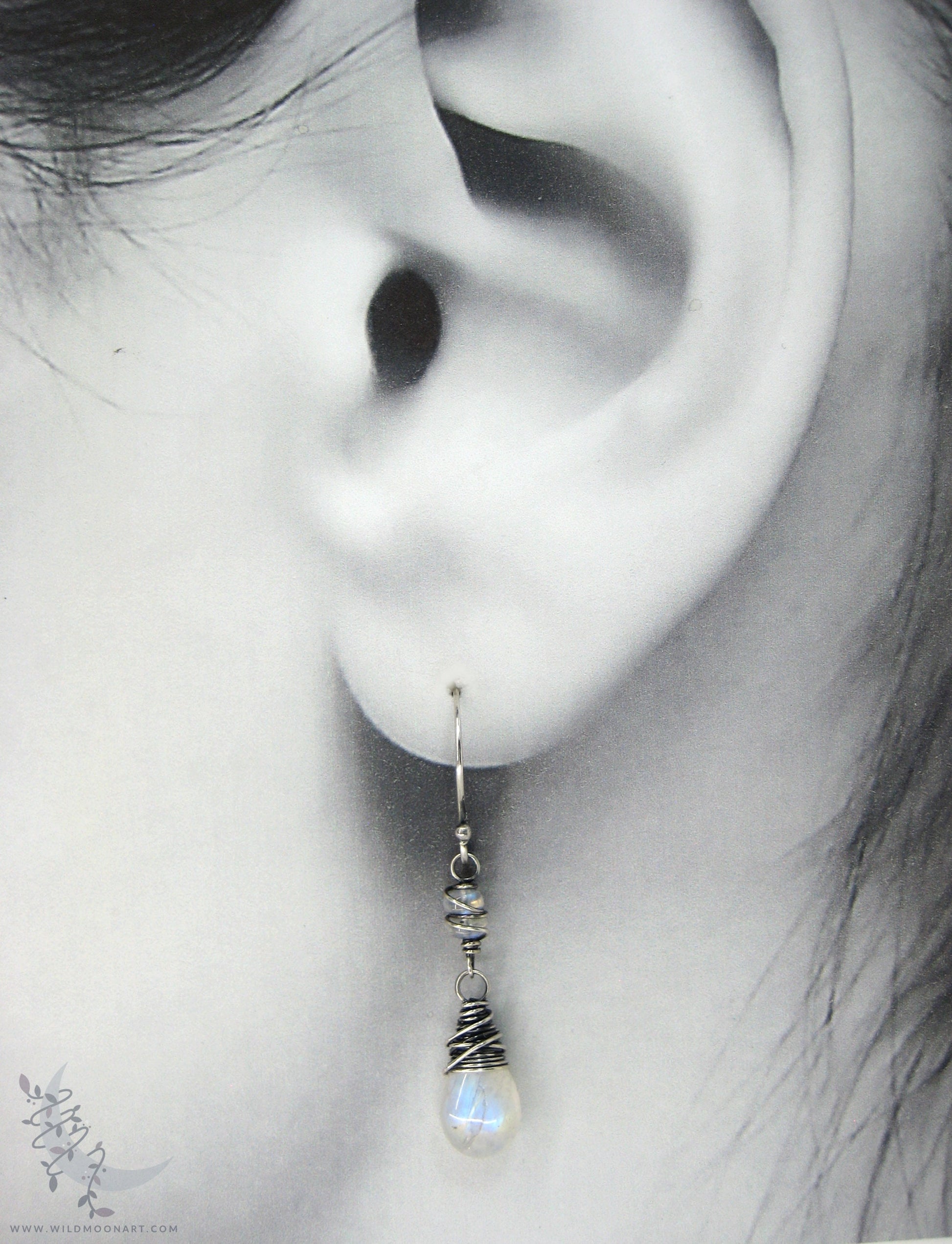 Gorgeous genuine Rainbow Moonstone gemstone briolettes have been wire wrapped in sterling silver, suspended from small wire wrapped moonstone gemstones, and sway from handmade sterling silver hook style ear wires. The sterling silver was oxidized (antiqued) to a deep charcoal finish, then hand brushed and polished to bring out the silver highlights. This gives an organic finish with depth.