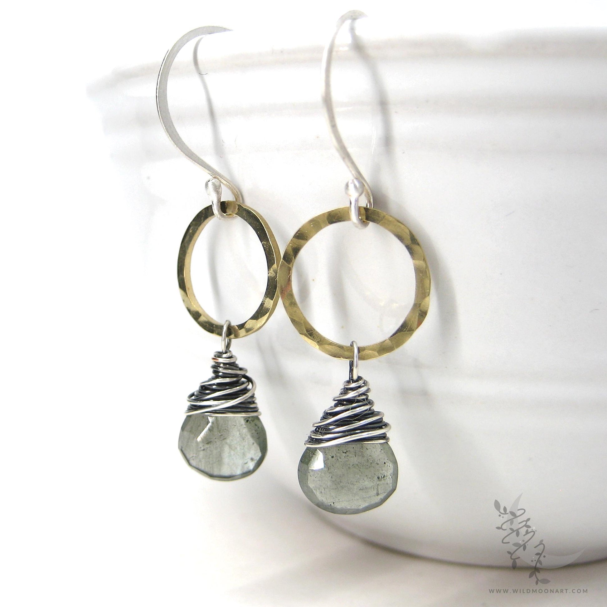 Dainty, earthy green genuine Aquamarine gemstone briolettes are wire wrapped in sterling silver, and sway from hand hammered raw brass circles and hand formed solid sterling silver ear wires. The sterling silver wire was oxidized to a deep charcoal patina, then hand brushed and polished to bring out the silver highlights. This creates a natural, slightly rustic finish with both depth & shine. The ear wires are bright shiny Sterling Silver.