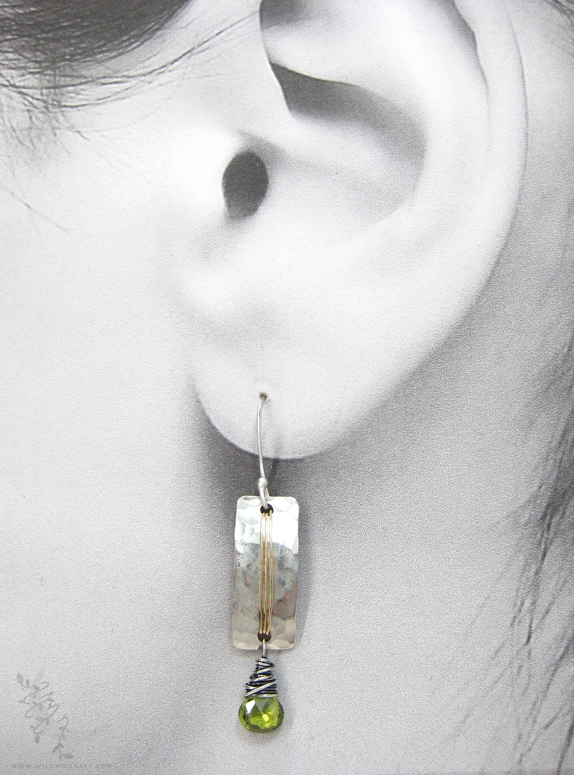 Dainty green genuine peridot gemstones are wire wrapped in sterling silver and attached to hand hammered and semi-matte finished fine silver filled rectangles. These are then wire wrapped in raw brass, and sway from handmade solid sterling silver ear wires. These petite genuine peridot gemstones are a beautiful bright lime/olivine green in color.