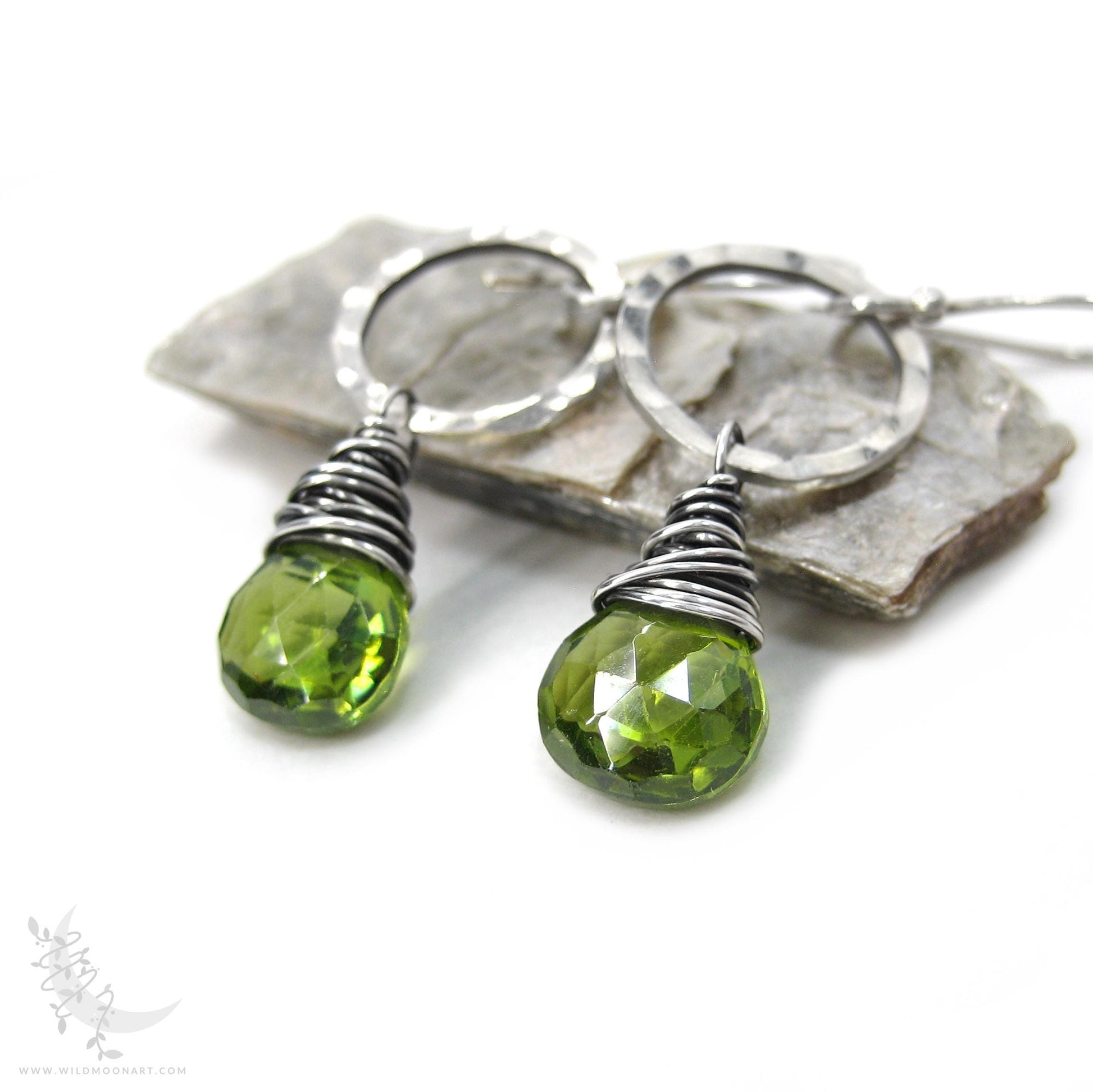 Dainty & bright olivine green genuine peridot gemstones are wire wrapped in sterling silver and sway from hand hammered Sterling Silver circles & handmade sterling silver ear wires. The sterling silver wire was oxidized (aged/antiqued) to a dark charcoal patina, then hand brushed and polished to bring out the silver highlights. This creates a natural, slightly rustic finish with both depth & shine. The ear wires are a bright & shiny finish.