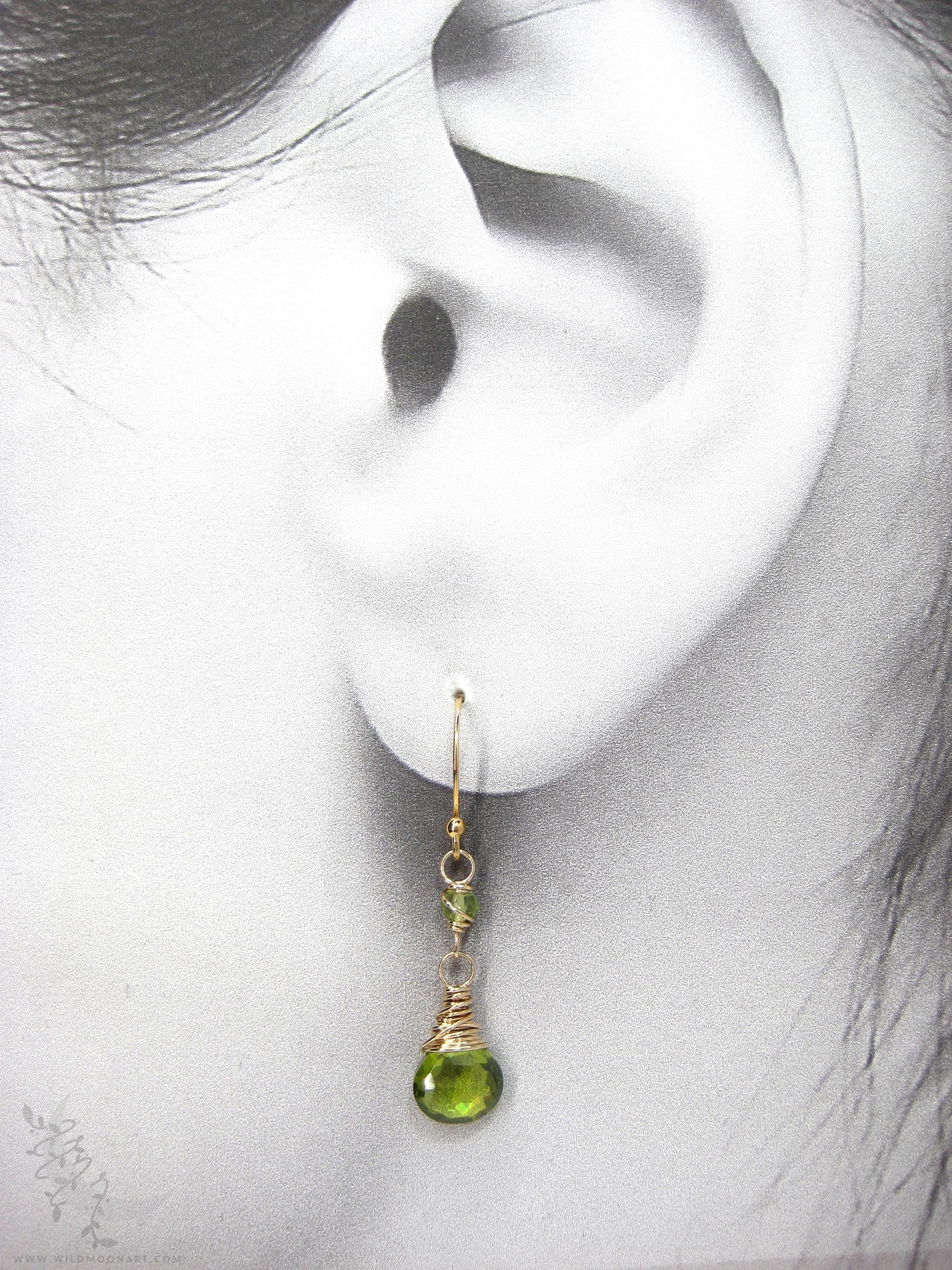 Petite genuine peridot gemstones are wire wrapped in 14k Gold Filled wire and dangle from handmade 14k gold filled ear wires. These natural, genuine peridot gemstones are a refreshing & bright olivine lime green in color. The main gems are cut in a "heart" briolette shape, and faceted for light reflection and eye-catching sparkle.