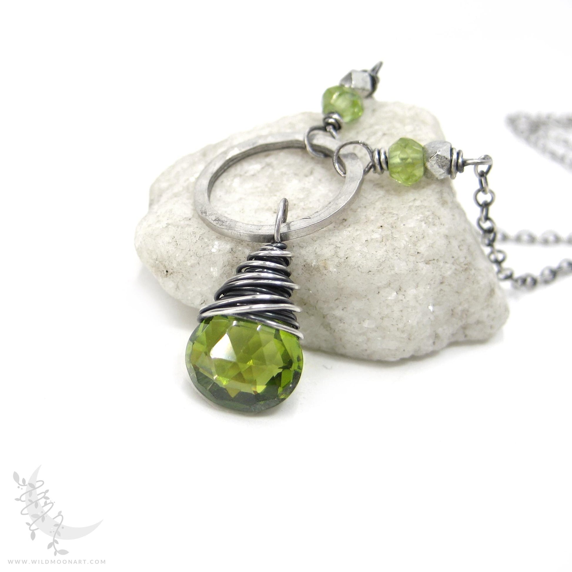 A single, dainty genuine peridot gemstone has been wire wrapped in sterling silver and sways from a hand hammered silver circle. These are attached to a sterling silver chain via wire wrapped faceted peridot and silver beads. The chain is finished at the ends with two additional faceted sterling silver beads and a sterling silver spring-ring clasp. The sterling silver was oxidized (antiqued) to a deep charcoal finish, then hand brushed and polished to bring out the silver highlights. This gives an organic finish with depth.