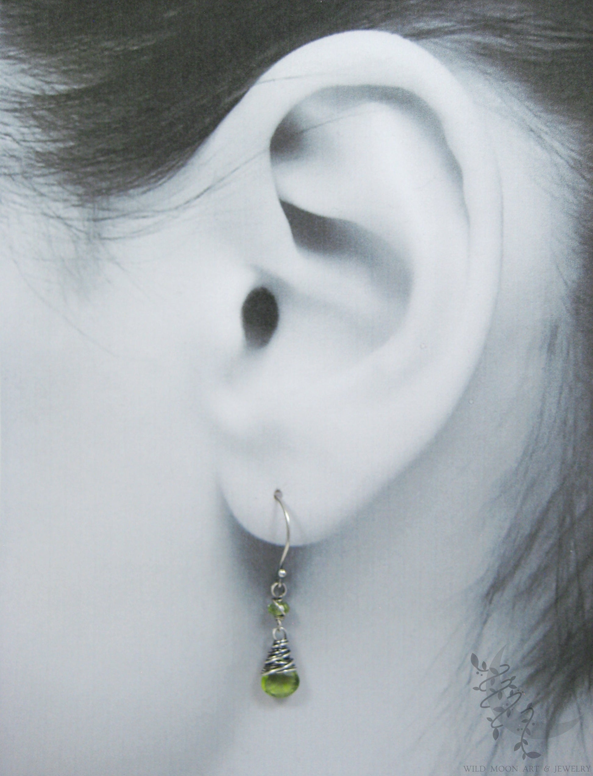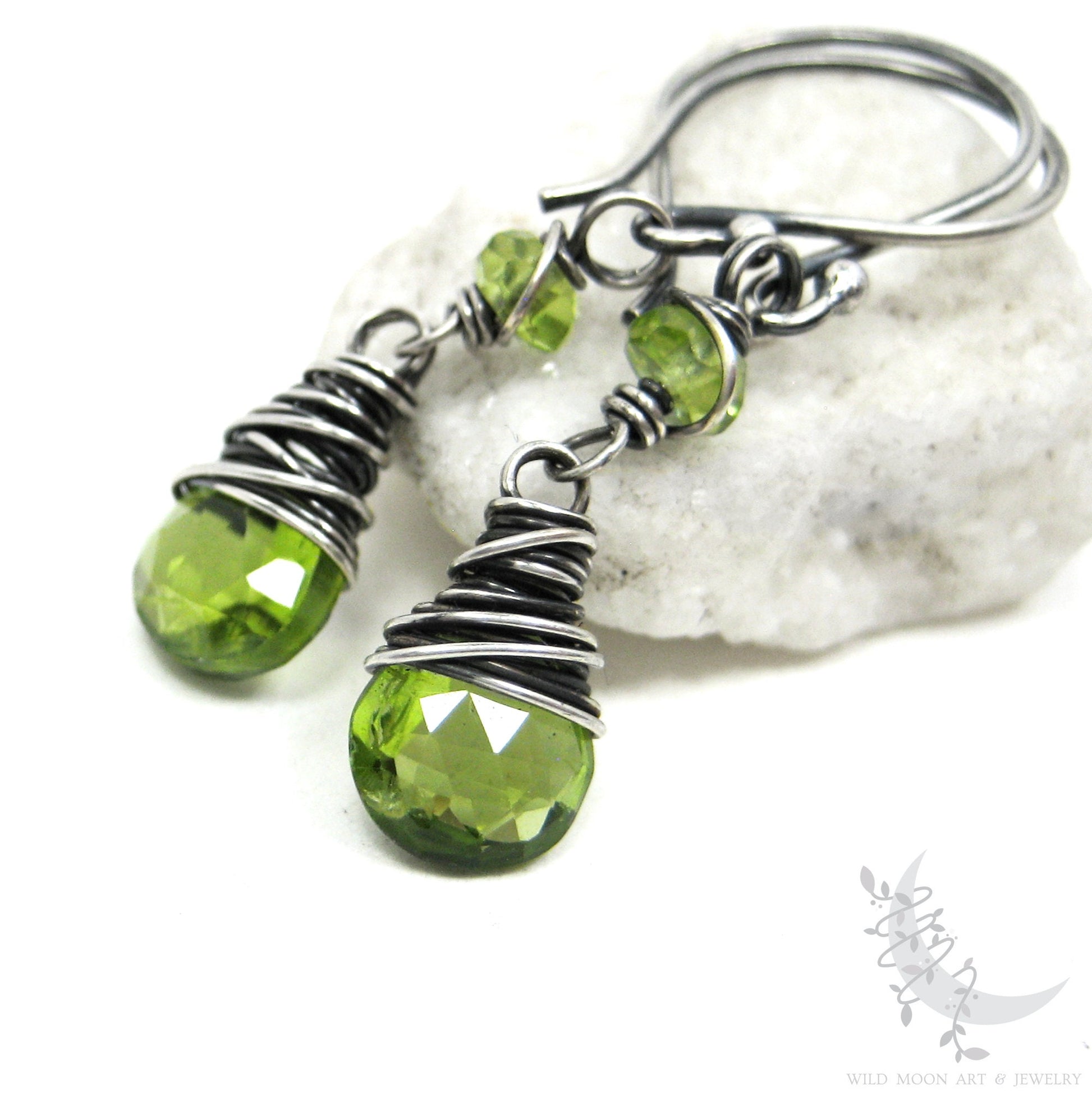 Handmade August Birthstone Jewelry Petite genuine peridot gemstones are wire wrapped in sterling silver and dangle from handmade sterling silver ear wires. The sterling silver was oxidized (aged/antiqued) to a dark charcoal patina, then hand brushed and polished to bring out the silver highlights. This creates a natural, slightly rustic finish with both depth & shine.