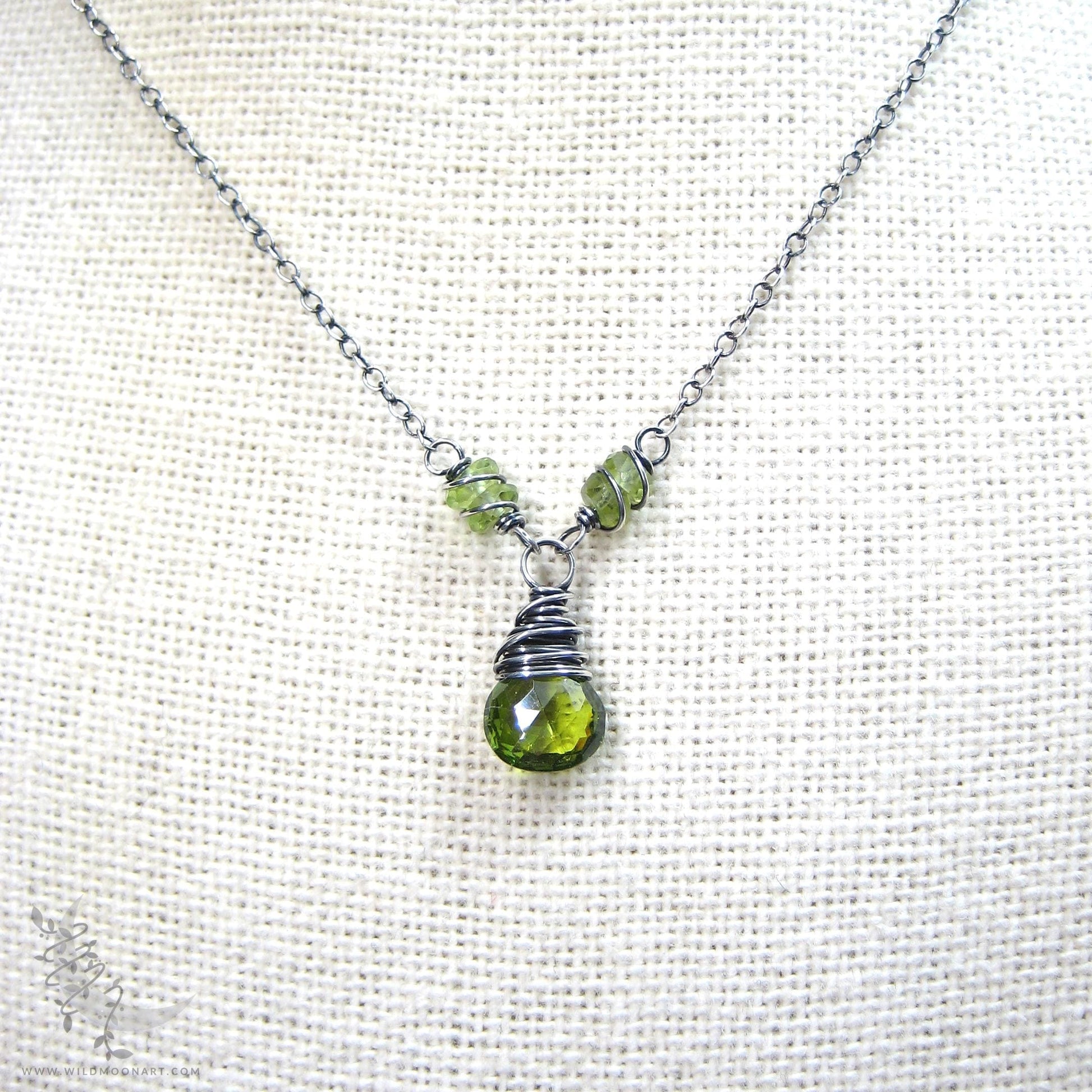 A single, dainty genuine peridot gemstone has been wire wrapped in sterling silver and is attached to a sterling silver chain via wire wrapped faceted peridot beads. The chain is finished at the ends with two additional faceted sterling silver beads and a sterling silver spring-ring clasp. The sterling silver was oxidized (antiqued) to a deep charcoal finish, then hand brushed and polished to bring out the silver highlights. This gives an organic finish with depth.