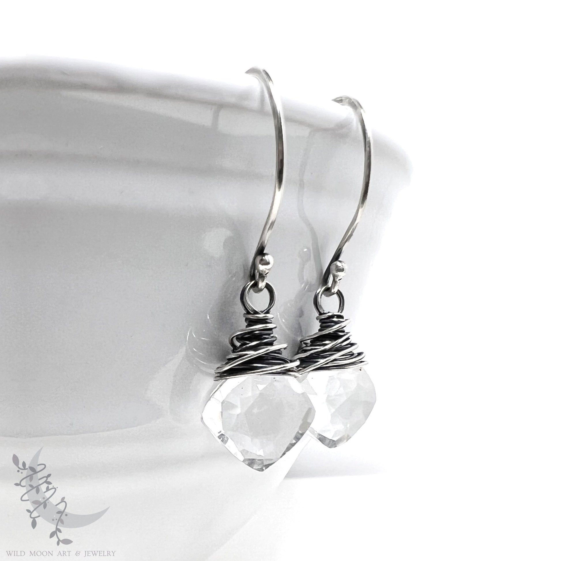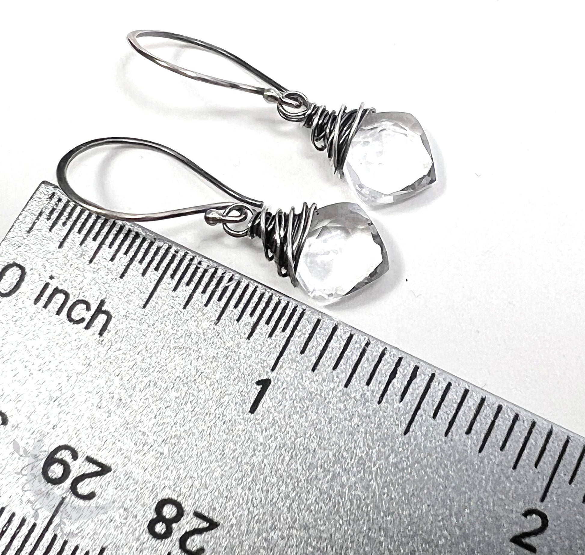 Genuine Rock Crystal Quartz gemstones have been wire wrapped in sterling silver and dangle from handmade sterling silver ear wires. The sterling silver was oxidized to a deep charcoal finish, then brushed and polished to bring out the silver highlights. This creates a natural, organic finish with depth & shine.