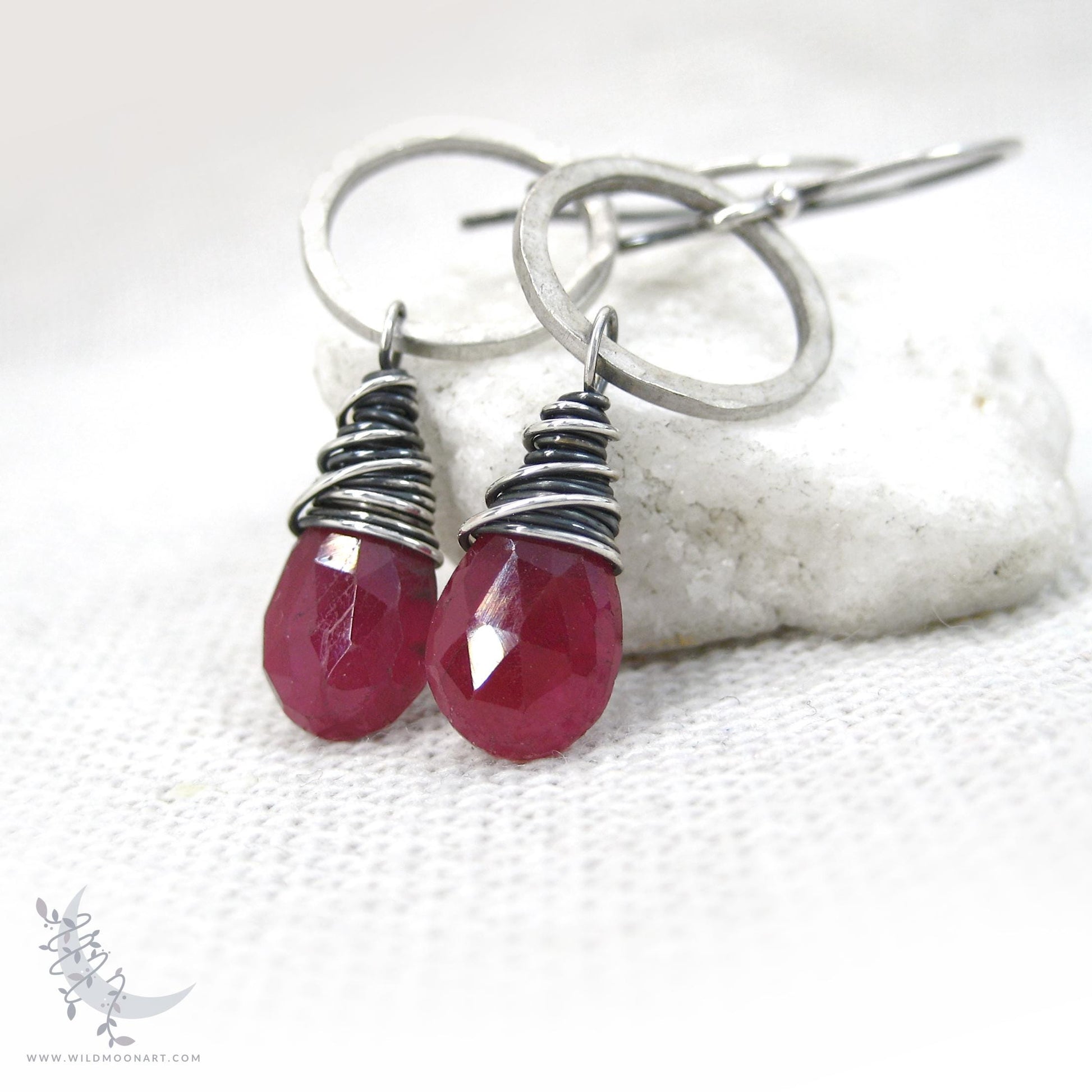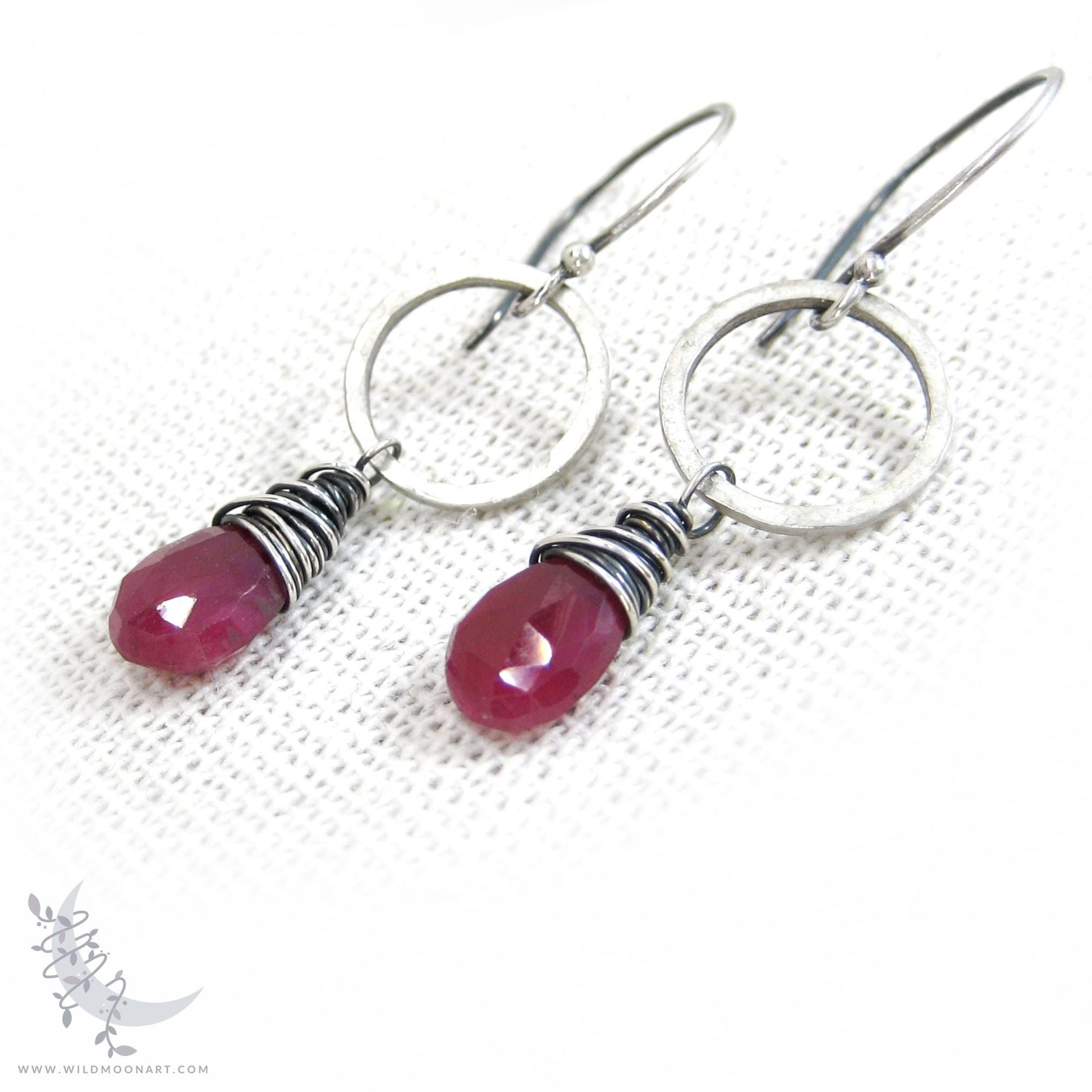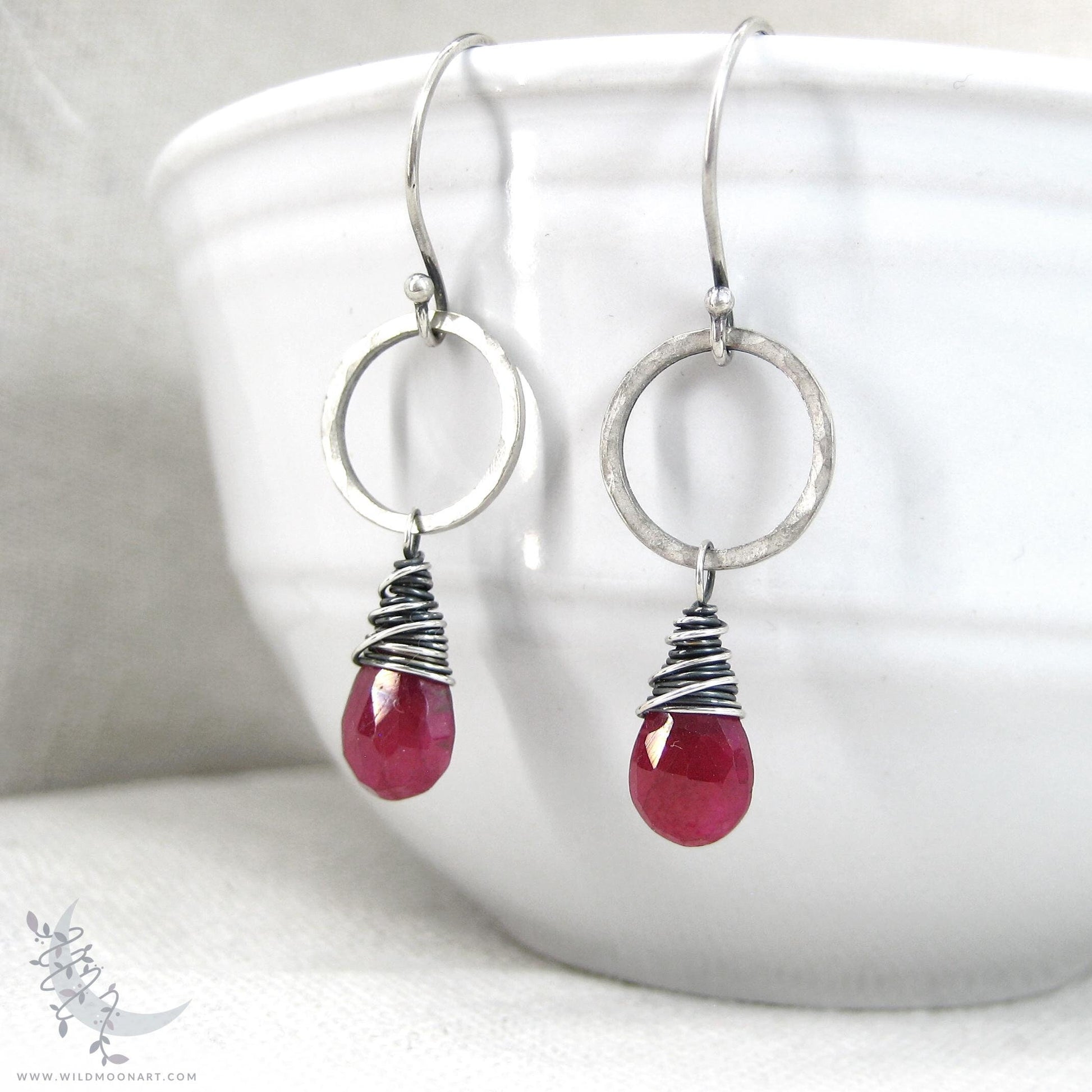 Hammered Silver Rich red, opaque genuine Ruby gemstone briolettes are wire wrapped in Sterling silver and suspended from hand hammered silver rings. The gems sway from handmade solid Sterling silver hook style ear wires. The Sterling silver was oxidized (aged/antiqued) to a dark charcoal finish, then hand brushed and polished to bring out the silver highlights. This gives an organic, natural finish with depth. The hammered silver rings have a slightly matte finish.